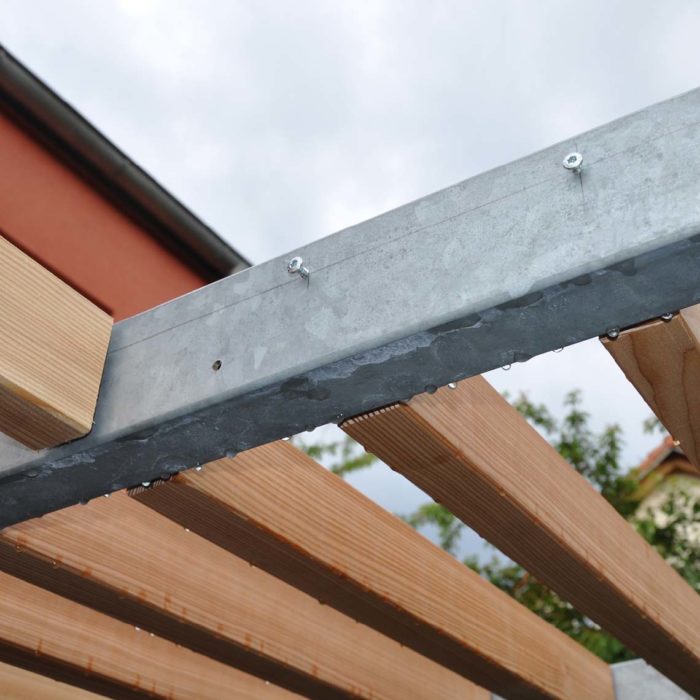 The Ramesberger family (DE) had a pergola installed on their terrace to protect themselves from the sun and prying eyes. The KNAPP UNO 30 stainless steel fastening system was chosen for its ease of assembly, weather resistance, and disassembly. A total of 5 frames of 23 larch cross beams were fixed to galvanized steel posts and beams using the UNO 30 system. In just two days, everything was quickly fixed without milling – the beams were weatherproof and strong – providing partial shade and privacy protection.