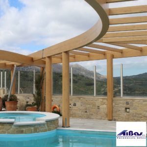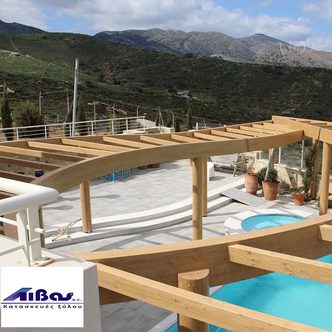 At Villa Blue Sky in Crete, a curved pergola in the shape of a giant leaf was assembled by using Knapp Ricon connectors. The construction covers the entire area of the bar and restaurant. The secondary beams are connected at an angle to the main beams so that the structure can provide shade from morning to night and at any time of day.