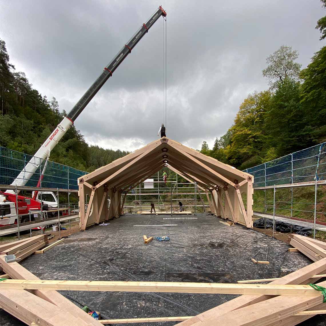 Structural System: Three-hinged frames made of BauBuche (bars) and synthetic resin-bonded wood (nodes)