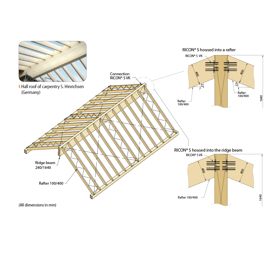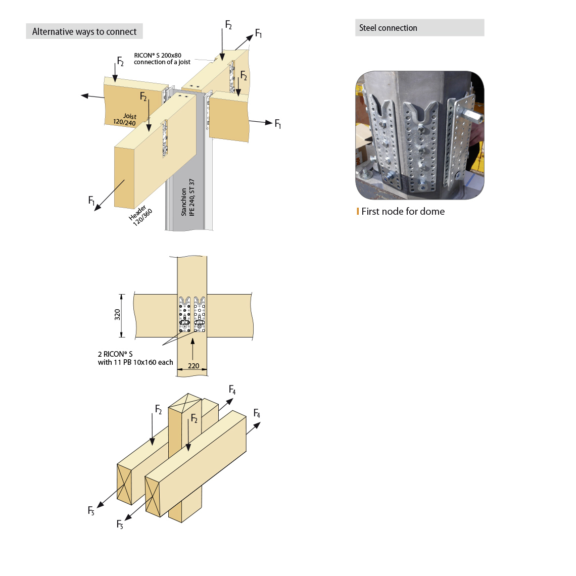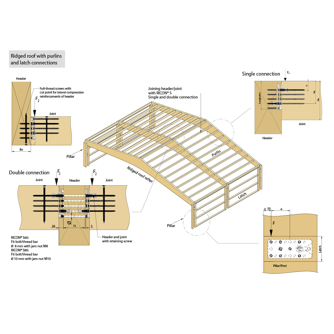 The RICON® S – System holds up to 230 kN and can be used for joints from timber to timber, steel, and concrete. The connectors can be installed fully concealed or visible with only 35mm (1 1/2″) of travel required to engage. The RICON® Connecting System is a unique connector for main and secondary beam joints and can be installed on beams with a width as little as 50mm. The GIGANT Connecting System was the first connector to be installed with screws in a perpendicular direction in the end grain and revolutionized the timber industry.