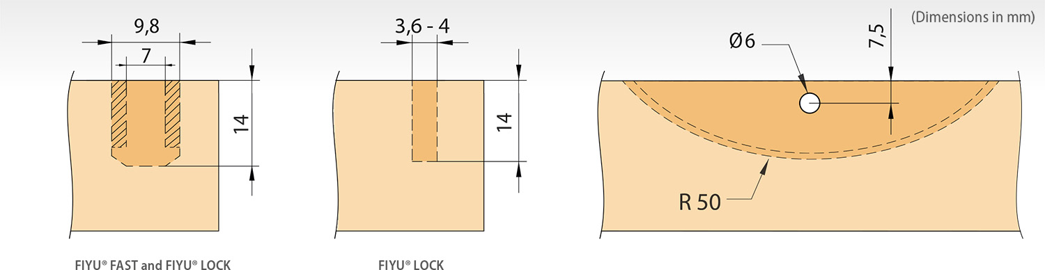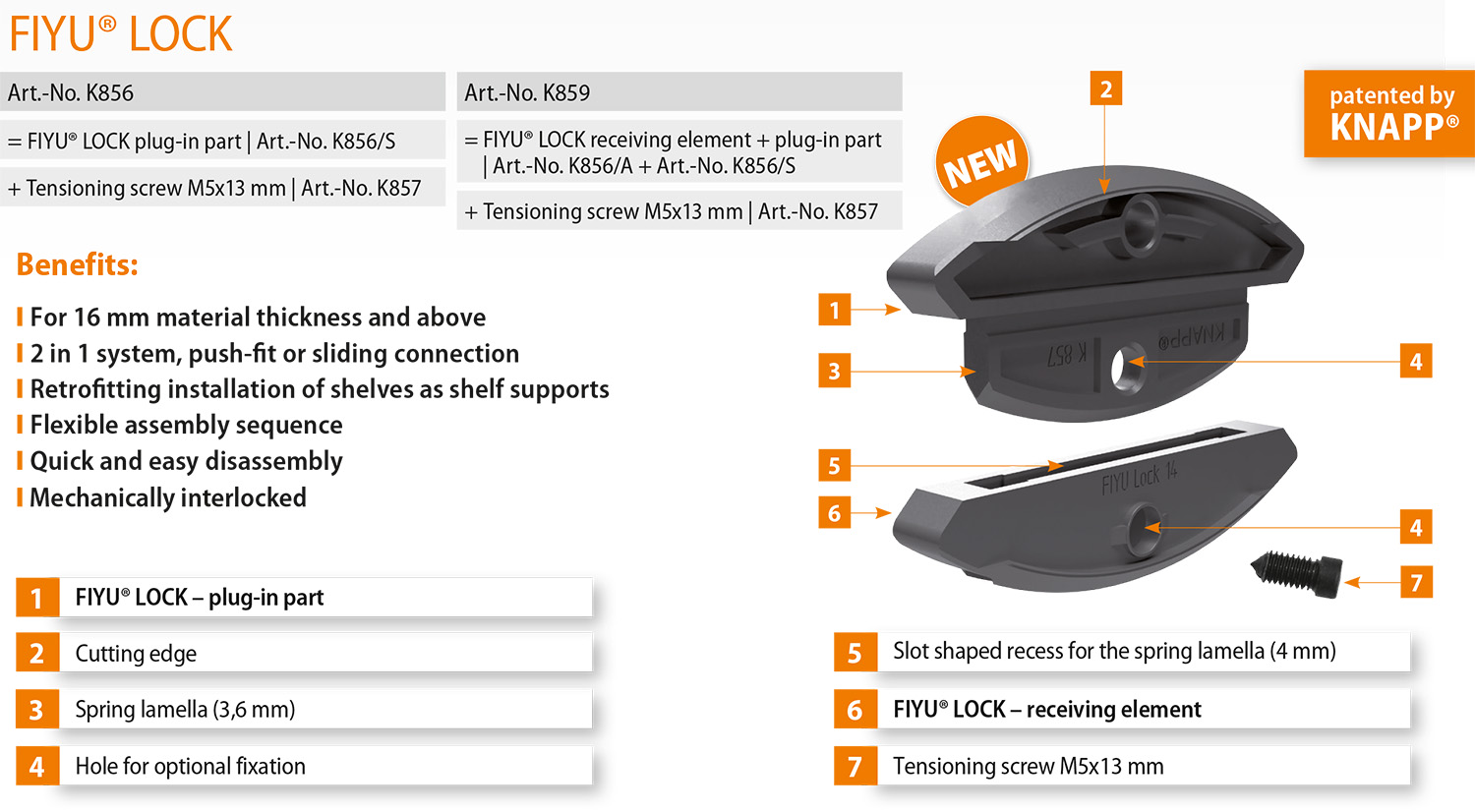 FIYU® – the connectors with cutting edges have clever details: Thanks to well thought-out details, it not only connects securely and exceptionally quickly, it is also ideal for countless areas of application. It connects cabinand parts from an angle of 0 to 135°. The FIYU® LOCK is a particularly suitable solution for retrofitting shelves. It even holds all by itself – saving time and money. Optionally, the connector can fix the components with a tensioning screw.