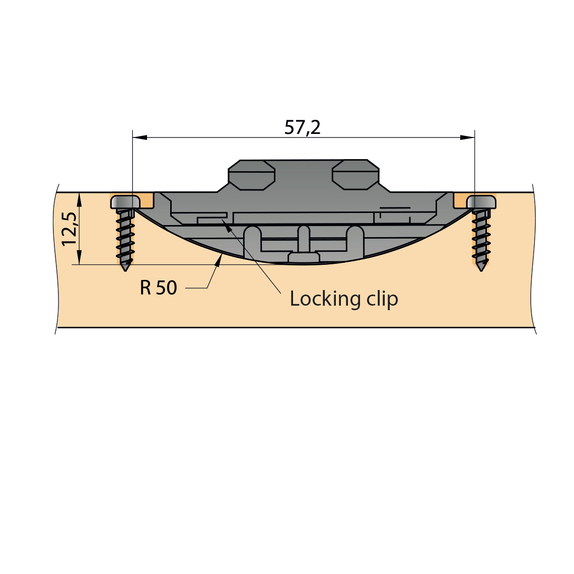 Cut a #20 slot using a suitable biscuit joiner and adjust the groove depth precisely to 12.5 mm using the micro-adjustment screw. Insert the connector mirrored into the pre-cut groove and fasten it with the supplied screws.