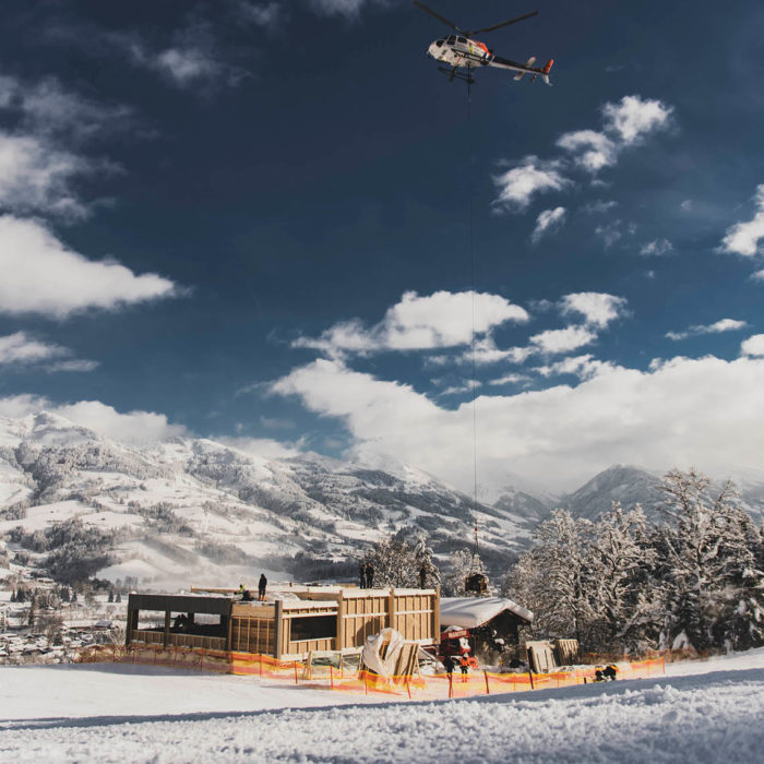 Chaque élément atteint un poids maximum de 800 kg, cela permet leur transport par hélicoptère et ainsi leur montage à Kitzbühel, le long d’une piste de ski, sur un emplacement accessible uniquement par un sentier forestier.