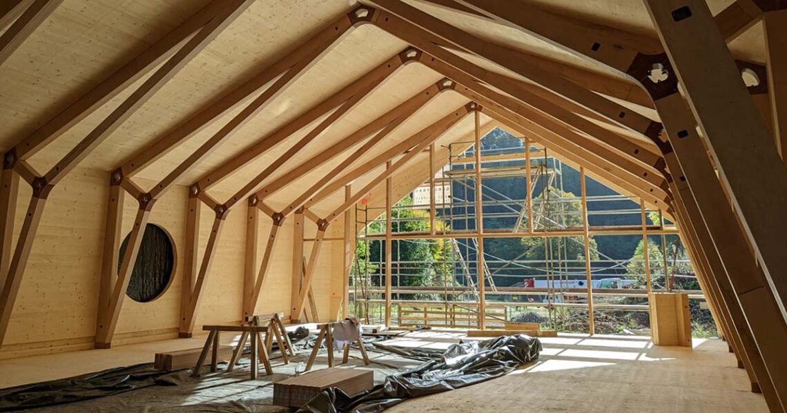 Les étudiants en architecture de l’Université technique de Rhénanie-Palatinat à Kaiserslautern-Landau (RPTU) ont développé et construit un centre de travail et de recherche sous la supervision du département de recherche t-lab, en étroite collaboration avec l’industrie. Ces derniers ont intégré des solutions innovantes conformes aux principes de l’économie circulaire pour la construction bois, telles que des adaptateurs coniques en bois de résine pressée et des connecteurs invisibles en acier Knapp, faciles à monter et à démonter, qui ont été utilisés pour la fixation des éléments muraux isolants en bois.