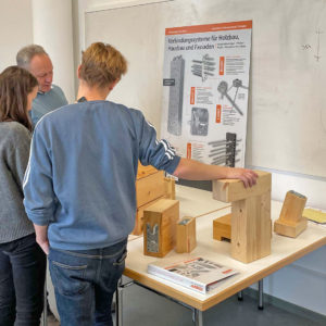 Nous avons été conviés par l’université technique de Munich à participer à leur cours « Grand projet ». Ce cours traite avant tout des solutions d’assemblage dans la construction bois et permet aux étudiants d’acquérir un savoir-faire technique. Le thème abordé a été la construction d’un pont pour cyclistes à Thalkirchen/Munich (DE). M. Siegfried Heinzmann, notre spécialiste pour la construction bois dans le sud de l’Allemagne a pu guider les étudiants à déterminer quels connecteurs Knapp seraient les mieux adaptés au cahier de charge du projet. Grâce aux échantillons les élèves ont pu manipuler les différentes solutions et se rendre compte de la praticité et de la facilité d’assemblage avec les connecteurs Knapp.