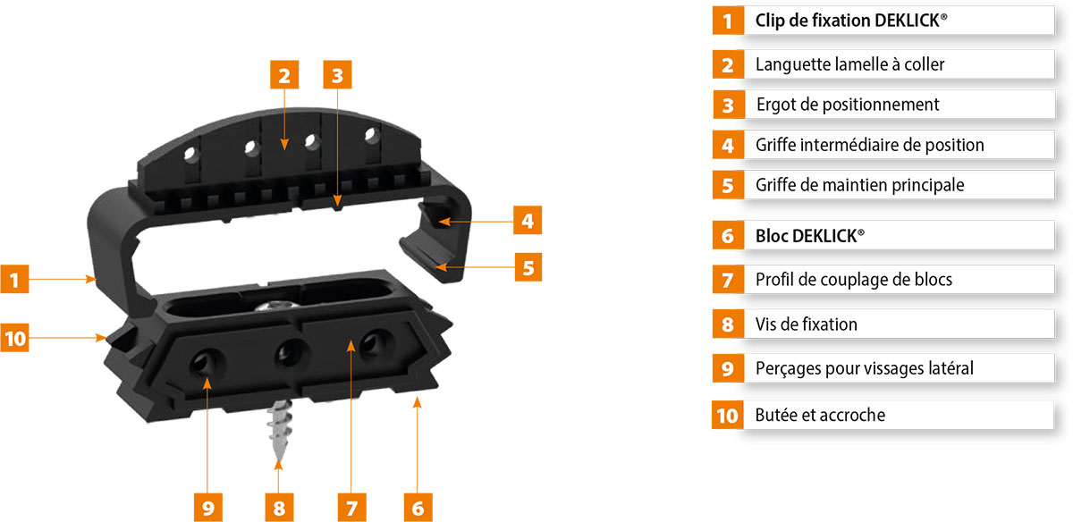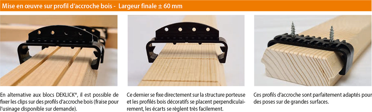 Les étapes de montage se décomposent comme suit. Positionnement et montage des blocs ou des profils d’accroche bois sur la structure porteuse – clipsage des clips DEKLICK® sur l’un des moyens d’accroche – encollage des