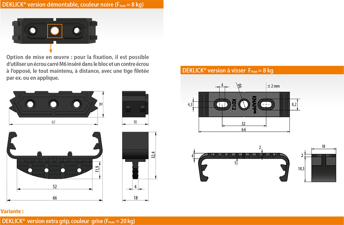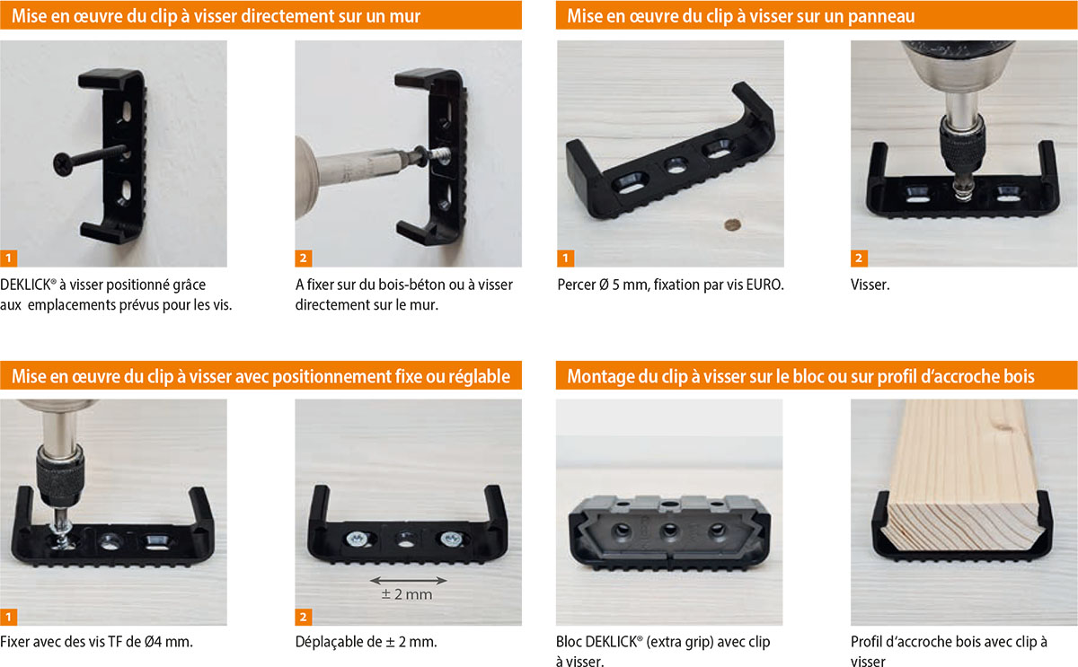 La version de clip DEKLICK® à visser, complète les possibilités de montage et permet une fixation très rapide. Ces clips peuvent être fixées directement sur des pièces supports à l’aide d’une vis EURO sur le milieu ou par 2 vis à l’entraxe de 32 mm.