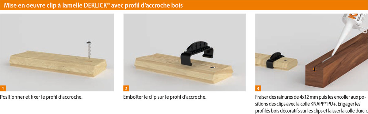 rainures pré-usinées sur les éléments décoratifs avec la colle KNAPP® PU+ et emboîtement sur la languette lamelle des clips.