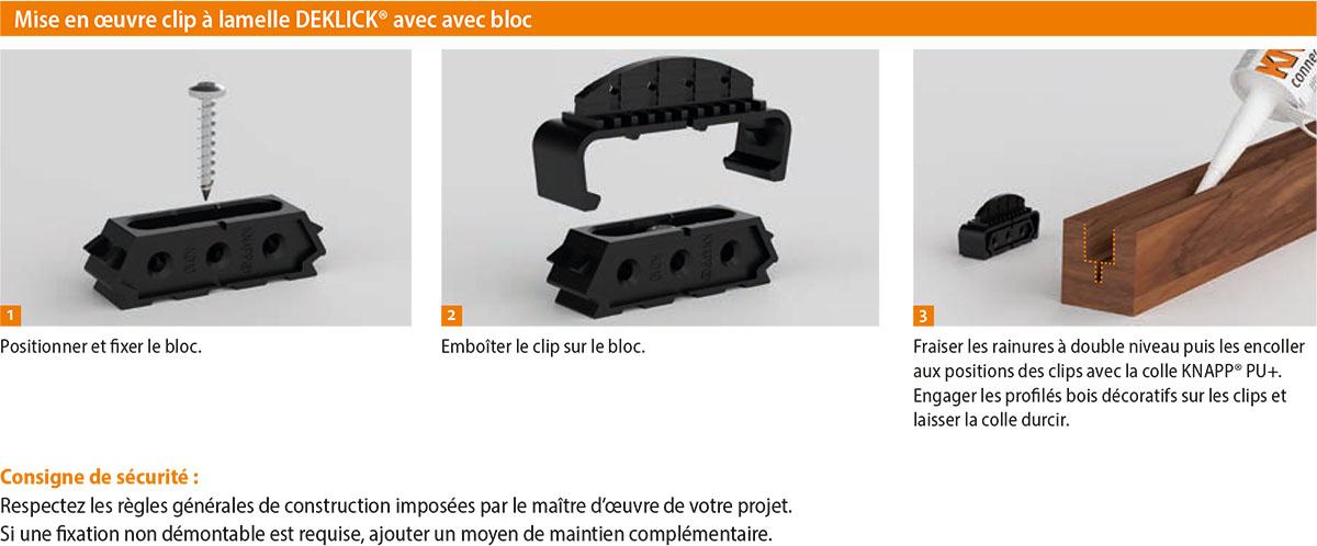 | Fixation : | Positionner et visser les blocs ou les profils d‘accroche (vis inox TF 5×50 mm), mettre les clips en position, encoller la rainure (colle KNAPP PU+), emboîter. |
