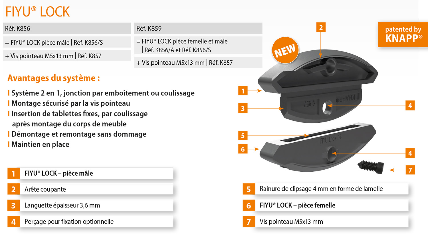 FIYU® LOCK a, suivant sa configuration, la particularité de permettre la réalisation de 2 types d’assemblage. Mis en œuvre avec les pièces mâles et femelles il permet la réalisation d’assemblages par emboîtement et avec l’utilisation de la pièce mâle seule, il permet l’insertion et la fixation de tablettes ou montants intermédiaires après montage du corps de meuble.