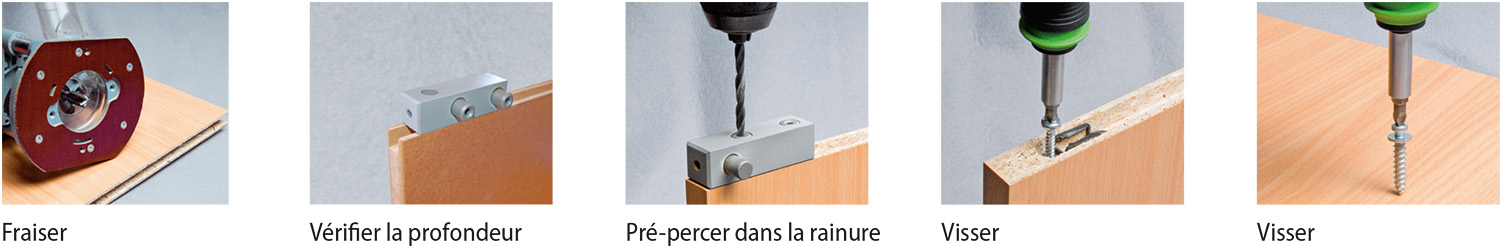 - Les poches destinées à recevoir les assembleurs sont généralement fraisées dans le chant des panneaux, mais elles peuvent également être fraisées sur la face si le design l’exige.