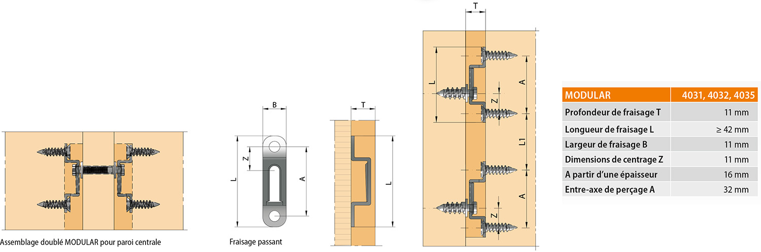 Le système MODULAR permet de liaisonner rapidement et facilement des panneaux entre eux, par simple emboitement, sans vissage, en toute sécurité et de façon invisible. Les assemblages réalisés apportent une très bonne rigidité de l’assemblage, pour le montage de caissons, dans certaines conditions il est possible de ne pas utiliser de panneau de fond pour la stabilité. En utilisant les versions dites « passantes » il est possible d’insérer des tablettes entre 2 montants fixes, par simple glissement de la tablette de l’avant à l’arrière tout en gardant l’invisibilité des assemblages. Pour les versions non verrouillantes et semi-verrouillantes le démontage et le remontage est possible de très nombreuses fois sans aucun dommage.