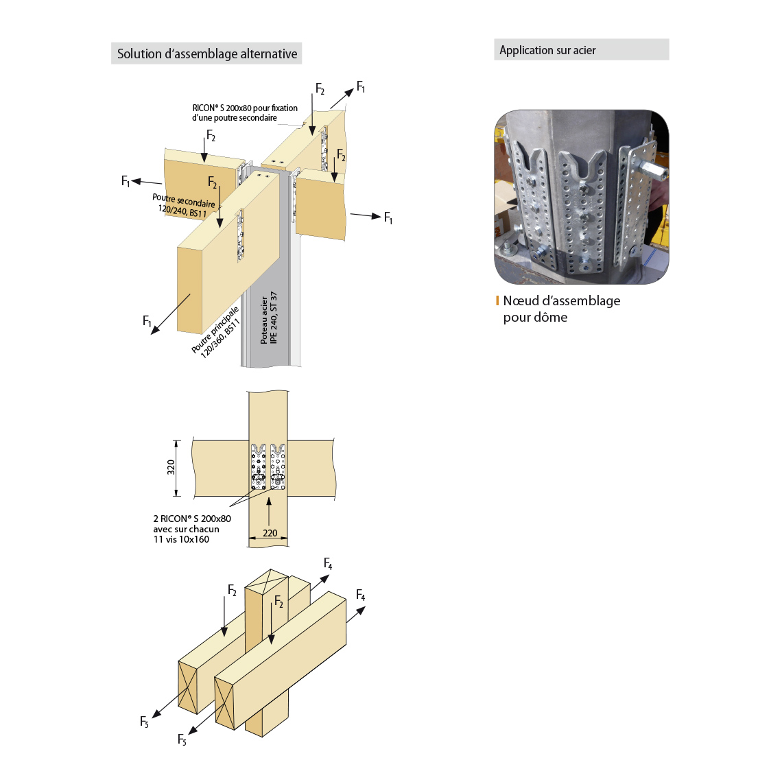 RICON® S est disponible en cinq dimensions et six variantes d’accroches pour répondre au maximum de cas d’assemblage sur bois, acier et béton.