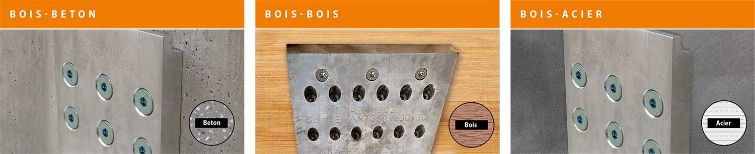 Possibilités de fixation et assemblage pour bois, matériaux bois, acier et béton.