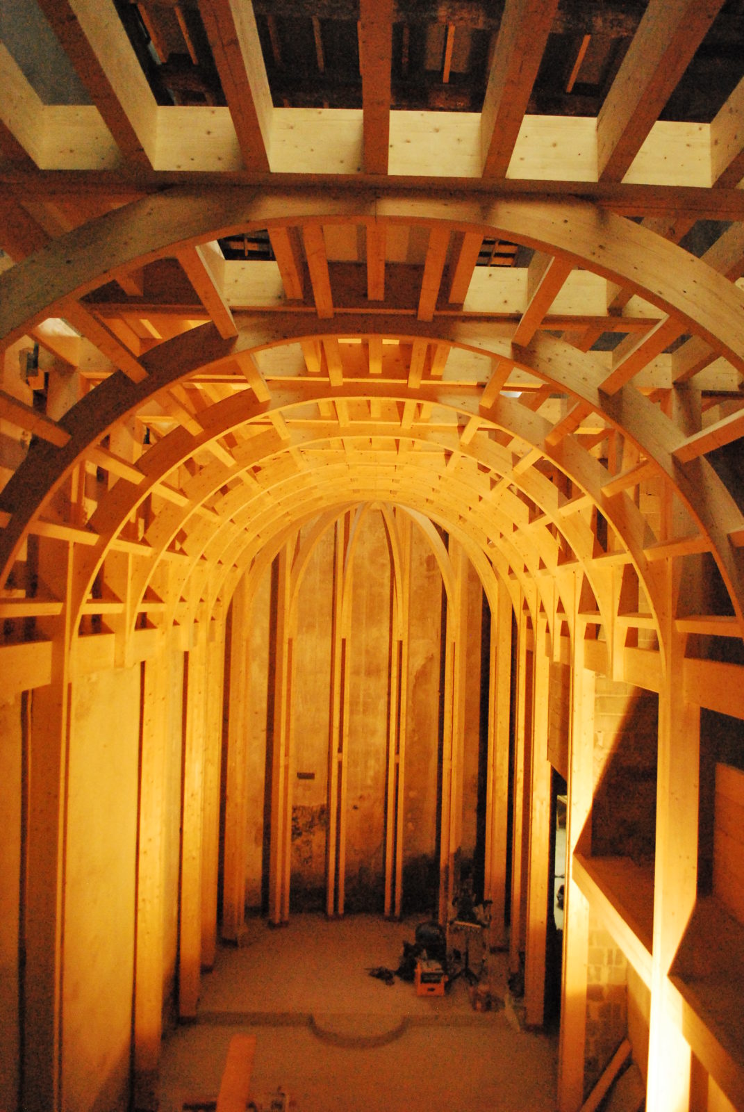 Type de construction : Dôme constitué de fermes arquées en bois lamellé-collé, portée arquée allant d’environ 10,80 m à 18,80 m