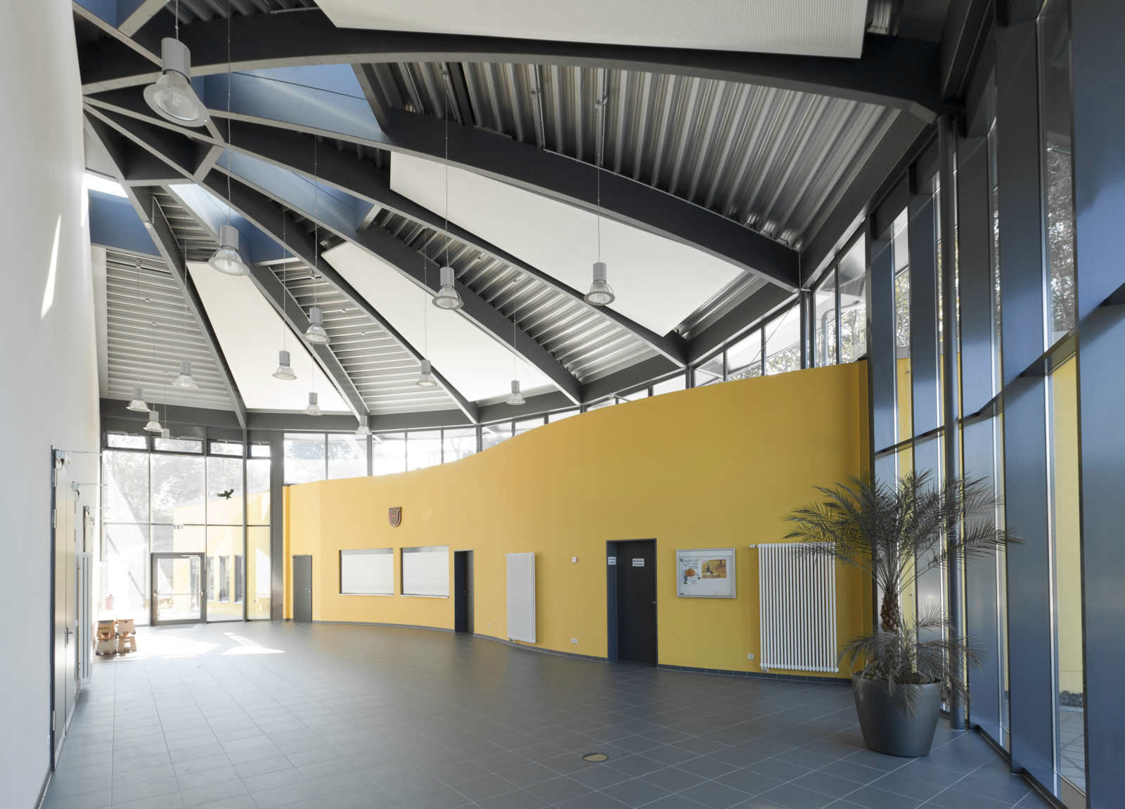 Type de construction : Structure en acier avec ossature en bois lamellé-collé (GLS).