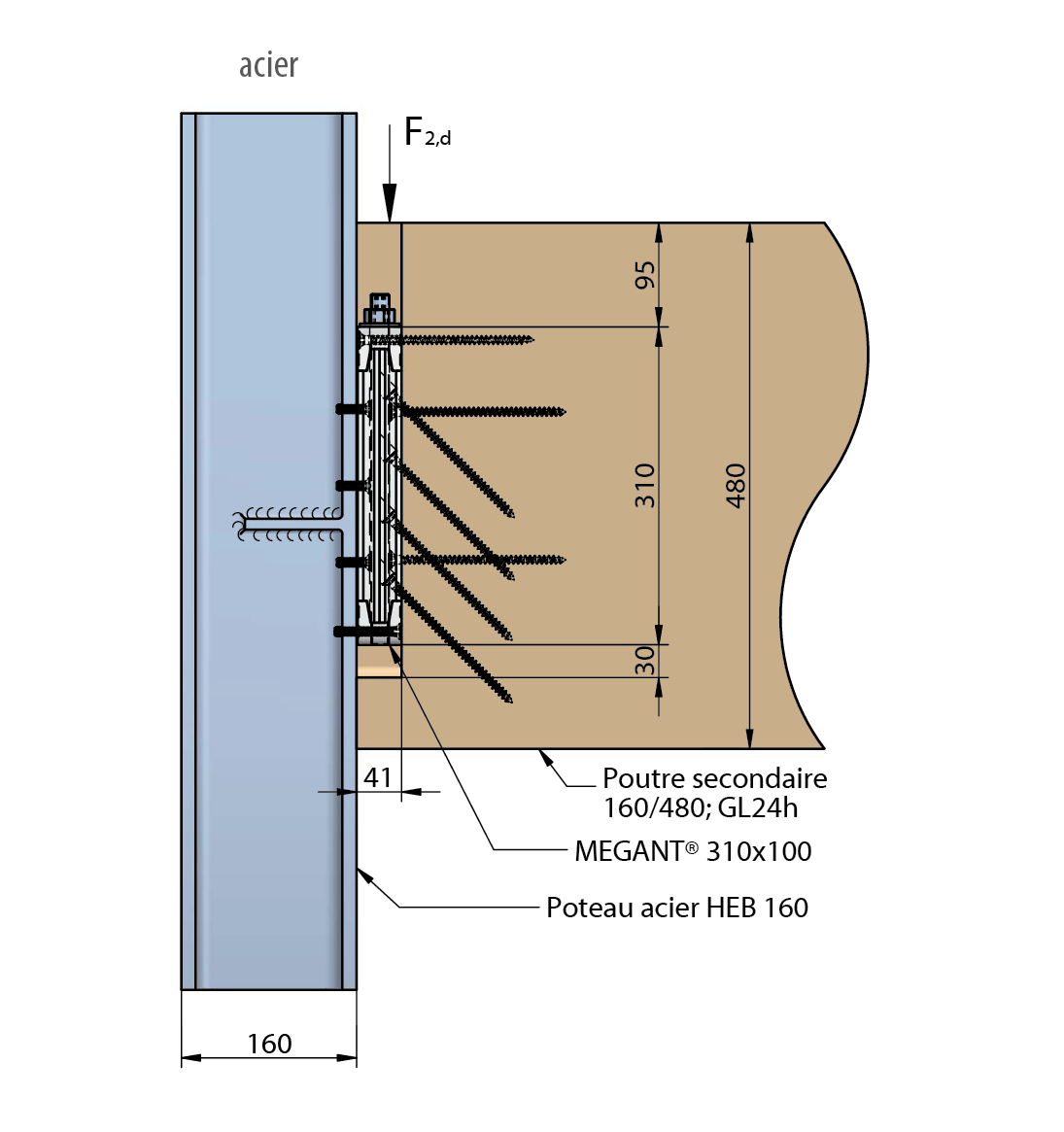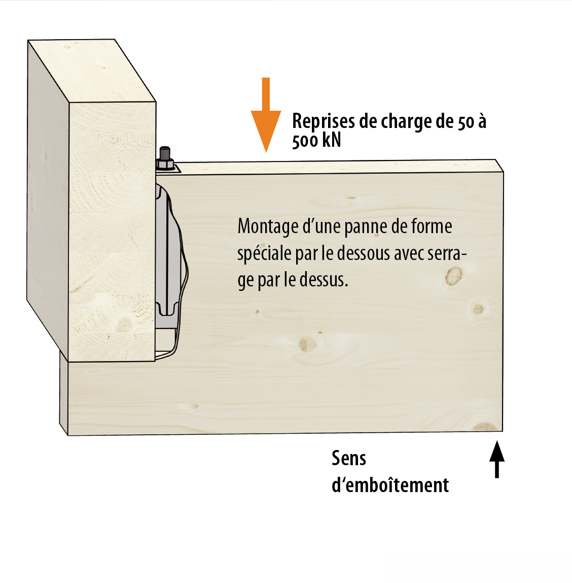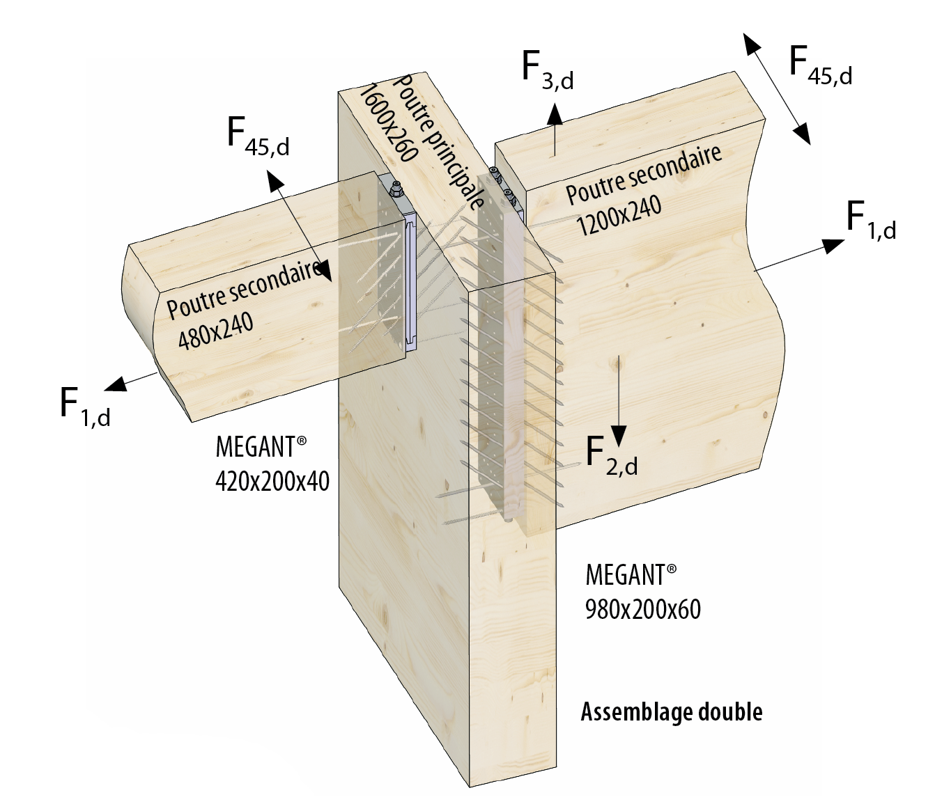 En dimensions standards, le système MEGANT® permet la réalisation d’assemblages de poutres principales et secondaires, à partir de sections de 100 mm d’épaisseur et jusqu’à une capacité de reprise de charge de 768 kN, sur une distance d’accroche de seulement 2 cm. De son côté, le système RICON®S offre des possibilités d’assemblages pour des charges jusqu’à 156 kN avec une distance d’accroche de 3,5 cm. Ces deux solutions d’assemblage peuvent se fixer au bois mais également à l’acier ou au béton. Les connecteurs MEGANT et RICON® S permettent une préfabrication très avancée et s’emboitent sans coincement.