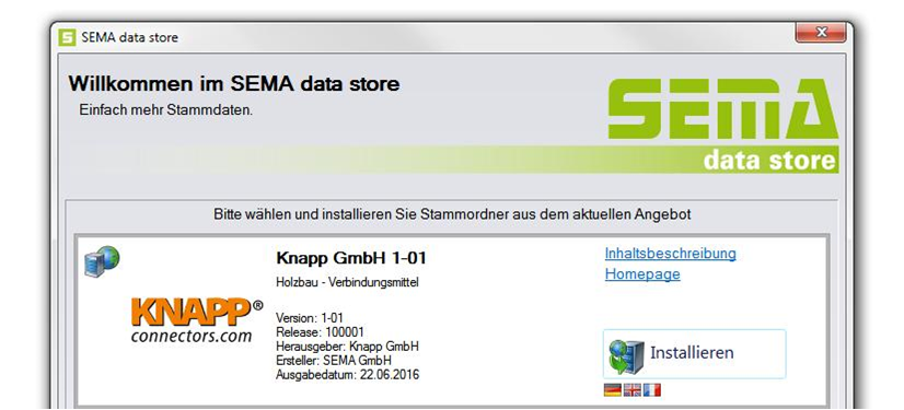 Wir reagieren auf die zahlreichen Kundenwünsche – ab sofort sind die Holzbau- und Wandverbinder im data store von SEMA implementiert und verfügbar. Auch die Implementierung in der Statik Software DLUBAL ist abgeschlossen. Dem SEMA-User ist es künftig möglich den Download der Stammdaten zu den Knapp-Verbindungssystemen im SEMA-Programm durchzuführen. Die Stammdaten der Knapp-Verbinder sind im SEMA-DataStore einfach via DataStore-Button erreichbar. Diese sind in den Sprachen Deutsch, Englisch und Französisch verfügbar.
