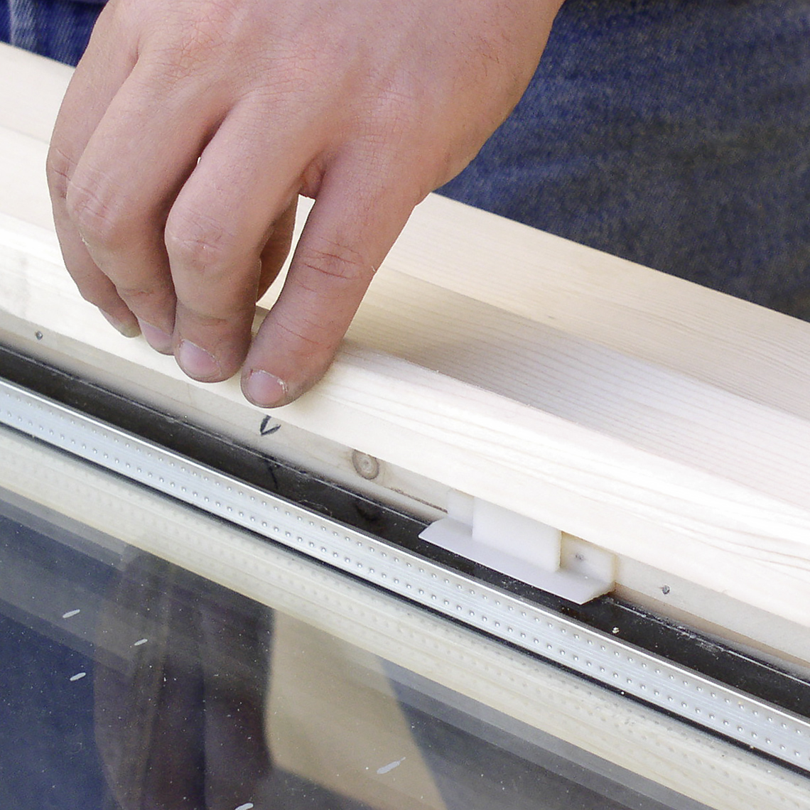 Der FIXclip ist ein Glas- und Profilleistenverbinder aus Kunststoff und ermöglicht eine völlig verdeckte Montage. Mit dem FIXclip werden Glasscheiben und Füllungen in Fenstern und Haustüren befestigt, ohne dass dabei die verschiedenen Profilleisten durch die herkömmliche Vernagelung beschädigt werden. Der FIXclip-Verbinder wird bei Holzfenstern und in fest verglasten Holz/Holz- und Holz/Aluminium-Fenstern eingesetzt. Der Verbinder ist in drei Größen H12, H16 und H20 erhältlich.