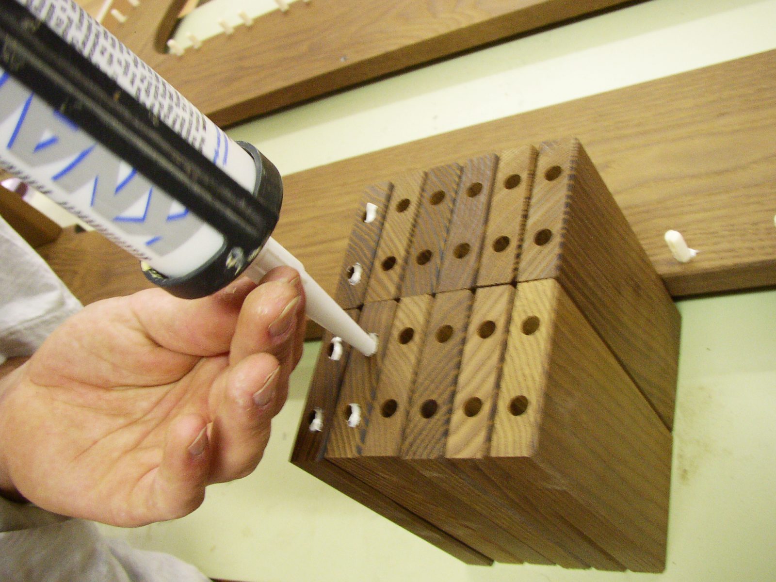 • Beim Einsatz unseres Dübels mit einem CNC Bearbeitungszentrum empfehlen wir PVAc Weissleim zu verwenden. Eine optimale Dosierung ist ohne weiteres über die Anlage einzustellen. Ein leichteres Reinigen der Anlage ist so möglich.