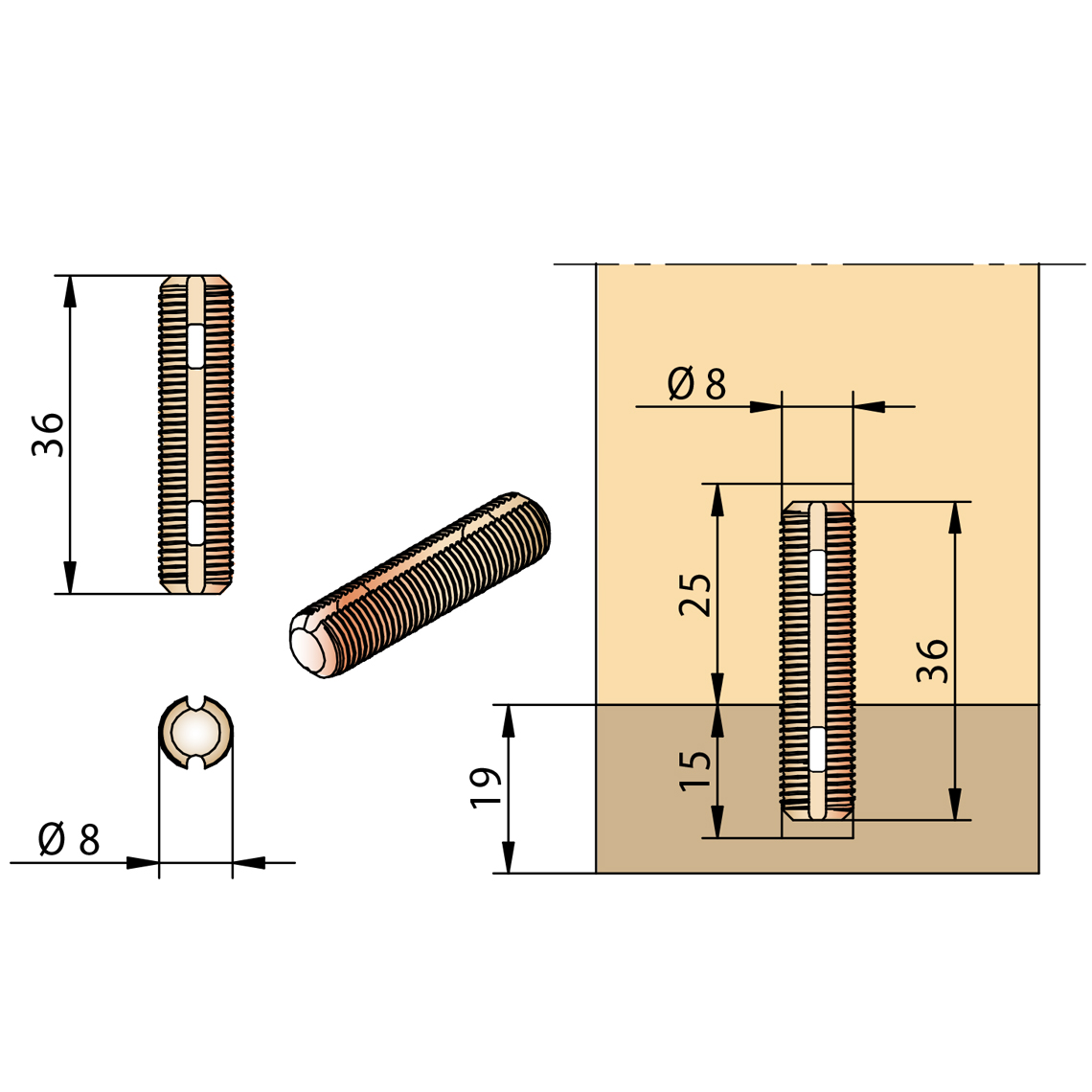 • Sicher – die Querrillen erhöhen die Haltekraft in der Bohrung – Platz für die Leimaufnahme zwischen Dübel und Bohrinnenwand – sichere Lagefixierung der Teile bis zum Aushärten des Klebers bzw. des Weissleim.