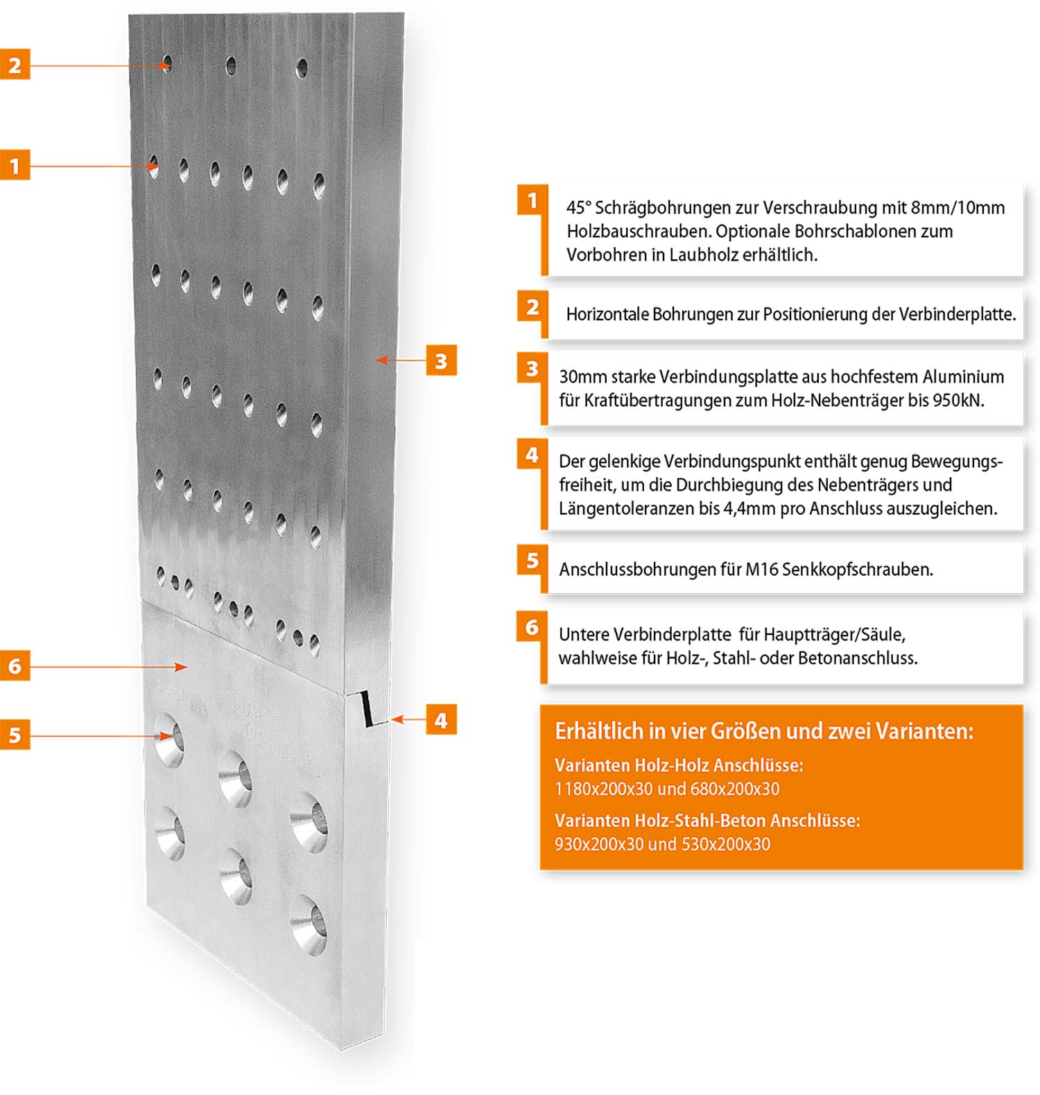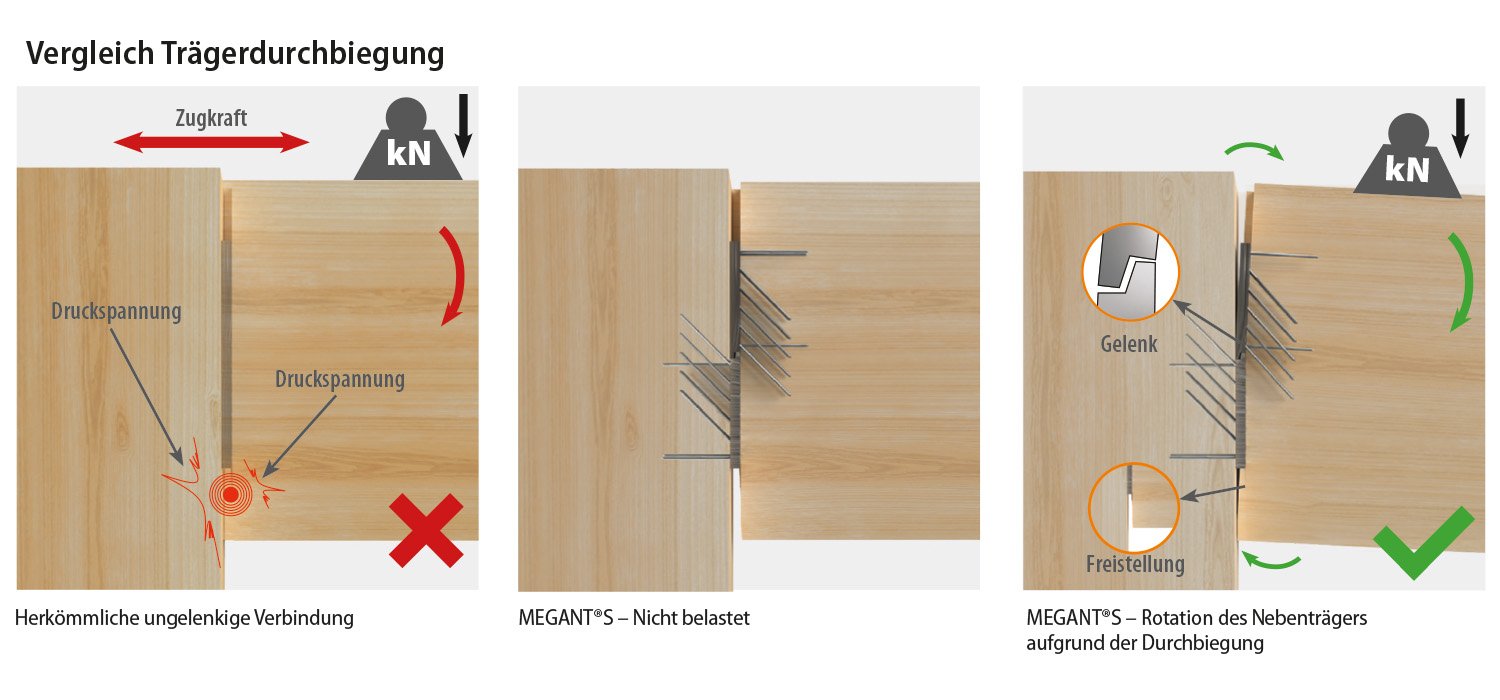 Durch seine gelenkige Konstruktion ermöglicht er die Durchbiegung des Nebenträgers, ohne dabei Probleme mit der Drehfedersteifigkeit zu bekommen. Dieses Verhalten vermeidet Spannungen in den zu verbindenden Bauteilen, was sich schonend auf die Gebäudesubstanz auswirkt. Der Verbinder ist somit ideal geeignet für hohe und lange BSH-Träger, die sich unter Last verformen können.
