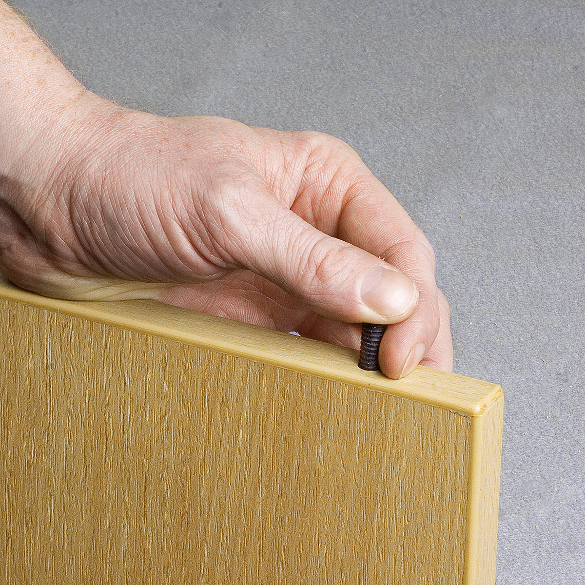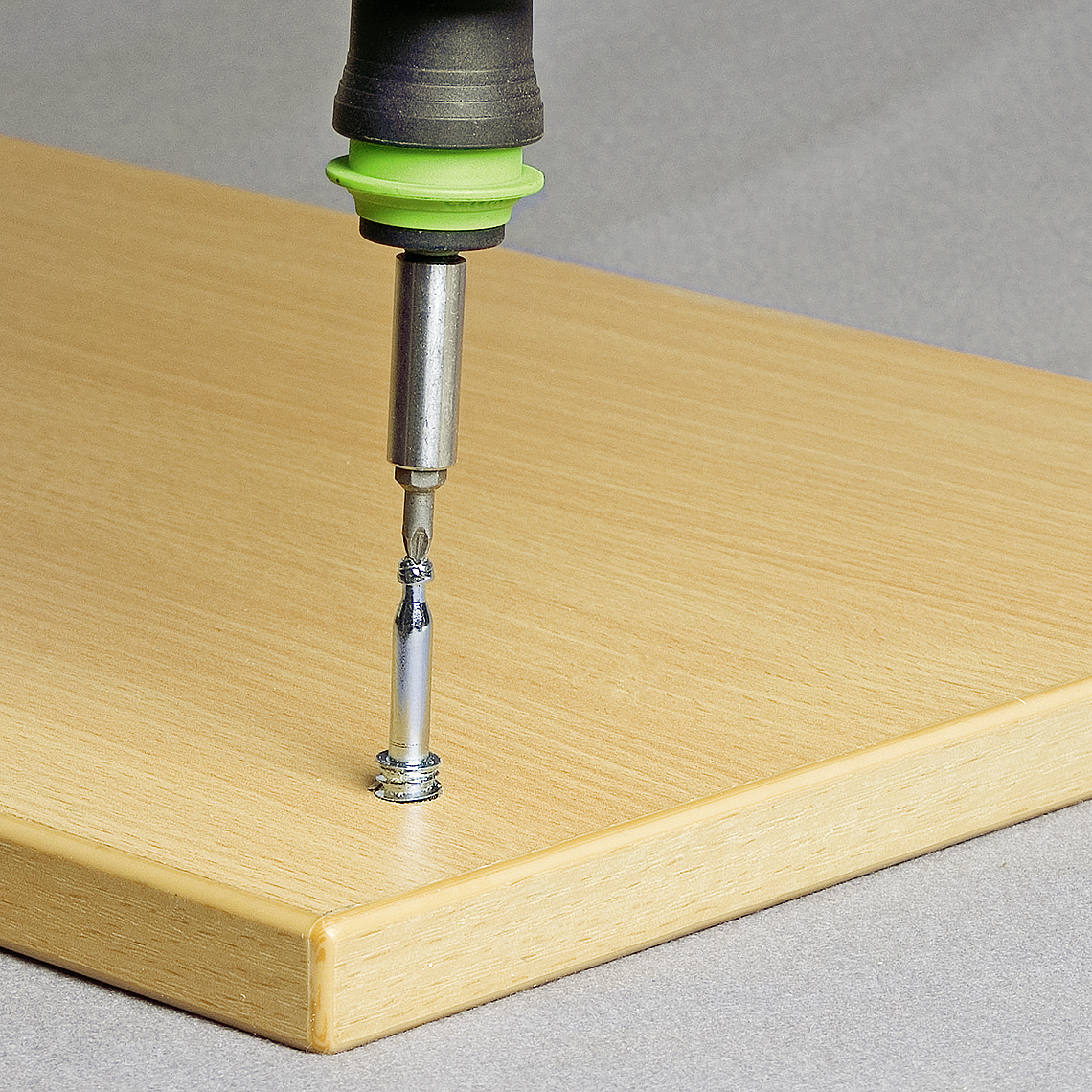 Der QUICK-SET ist ein einfacher und rationeller Korpusverbinder auf Dübelbasis. Es sind je zwei Versionen mit 5 mm Gewinde und mit 8 mm Gewinde lieferbar. Der Kunststoffdübel mit 8 mm verfügt über 8 und 26 mm Gewindelänge. Der Kunststoffdübel mit 5 mm verfügt über 7,5 und 11 mm Gewindelänge. Der QUICK-SET kann in 5 mm Reihenlochbohrungen und der QUICK-SET in 8 mm Dübelbohrungen eingesetzt werden. Auch bei Mittelseiten mit einer Materialstärke ab 16 mm kann er verarbeitet werden.