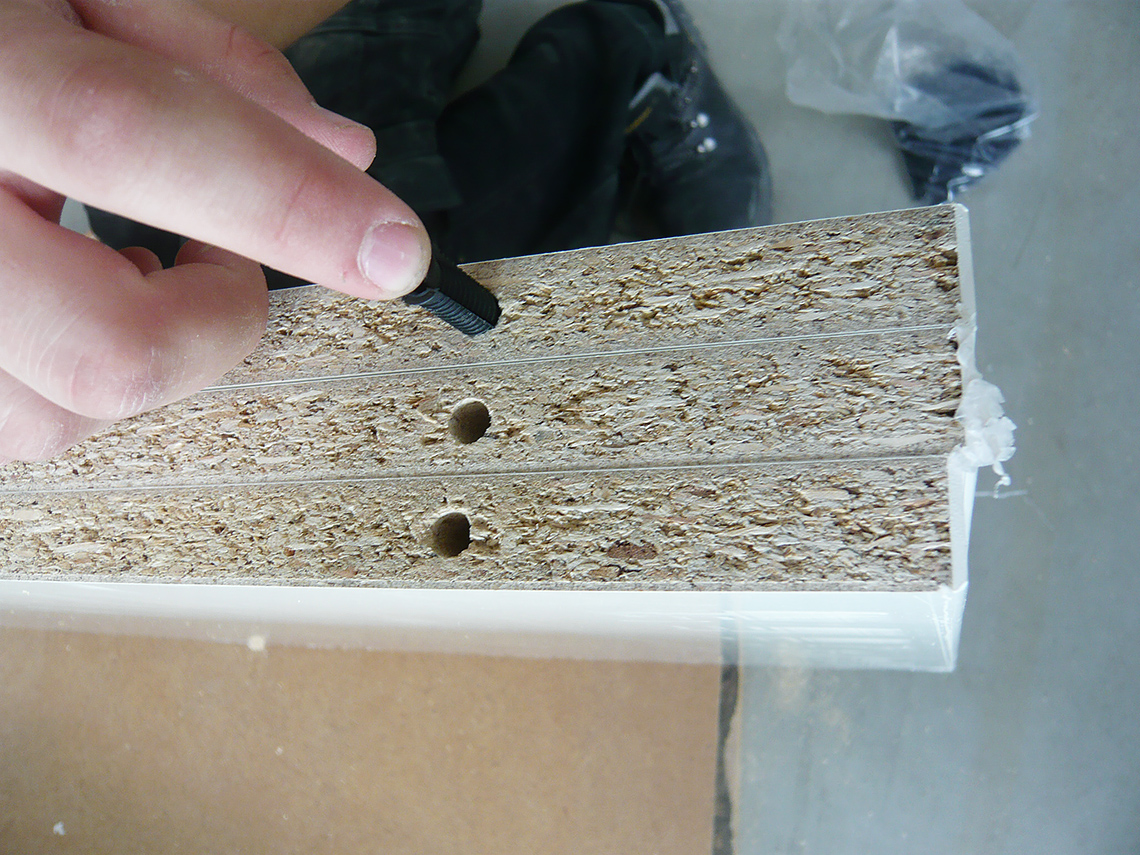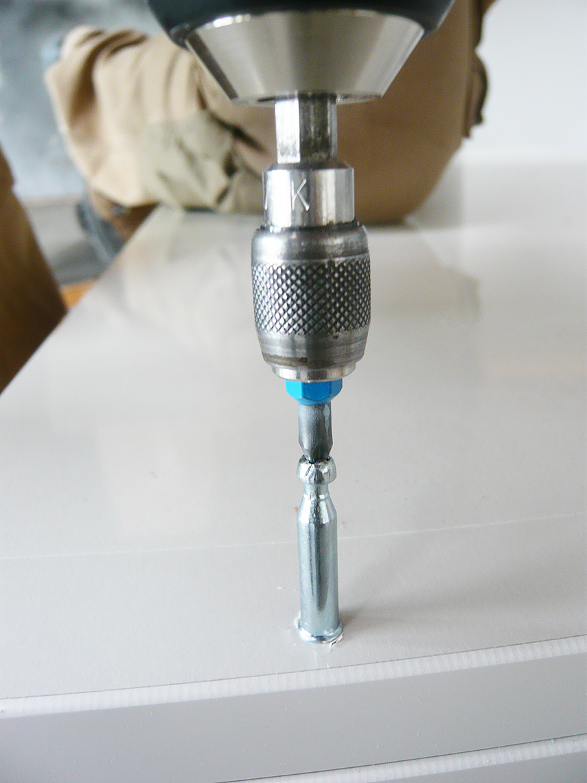 Die Bohrtiefe für den Kunststoffdübel ist auf 31 – 32 mm auszuführen. Dadurch wird beim Zusammenfügen ein optimaler Anzug des Schraubbolzen bis auf den Grund des Dübels gewährleistet. Es kann so keine „Haarfuge“ endstehen. Der Kunststoffdübel wird lose ohne Klebstoff in das Bohrloch eingesetzt.