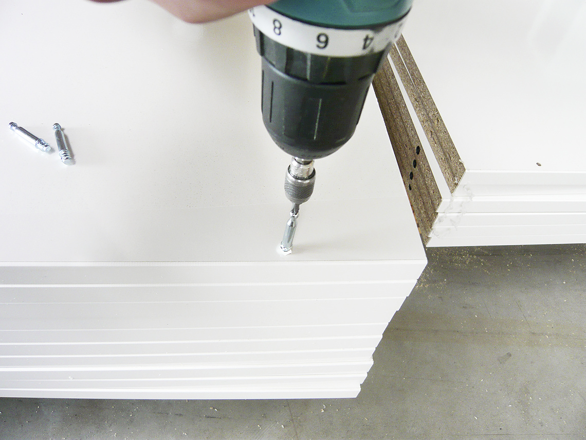 Nach der Vorbereitung mit beiden Bauteilen werden die Korpus- oder Möbelteile mit leichtem Druck zusammengefügt. Auf eine Länge von 600 mm empfehlen wir 5 bis 6 Stück QUICK-SET zu verteilen.