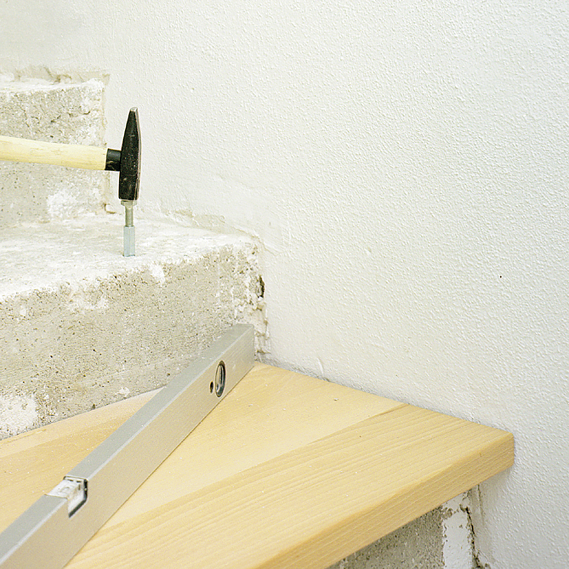 Die Sechskant-Dübel bündig einschlagen. Die Nivellierschrauben eindrehen und mit Wasserwaage oder Laser für jede Stufe einstellen.
