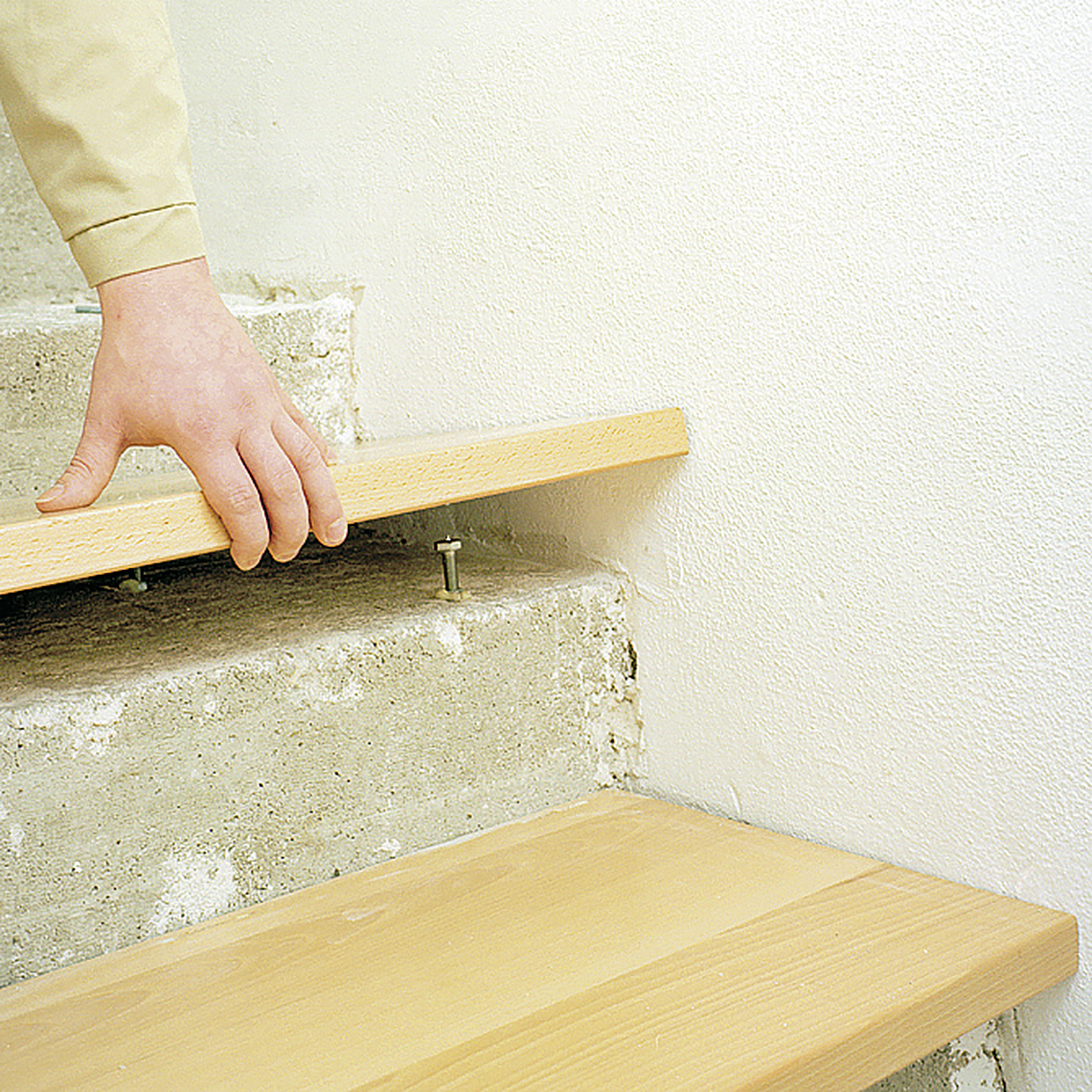 Eventuell eine Trittschalldämmung aufbringen. In die Bohrungen ein wenig KNAPP®-Kleber PM+ einbringen und die Stufe aufsetzen.