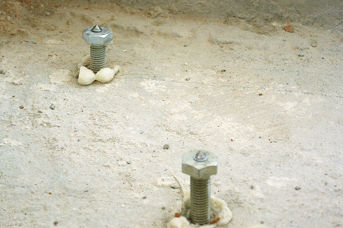 In die Anreißpunkte 6mm Löcher bohren. Die Gewindestifte in die Köpfe der Nivellierschrauben eindrehen.