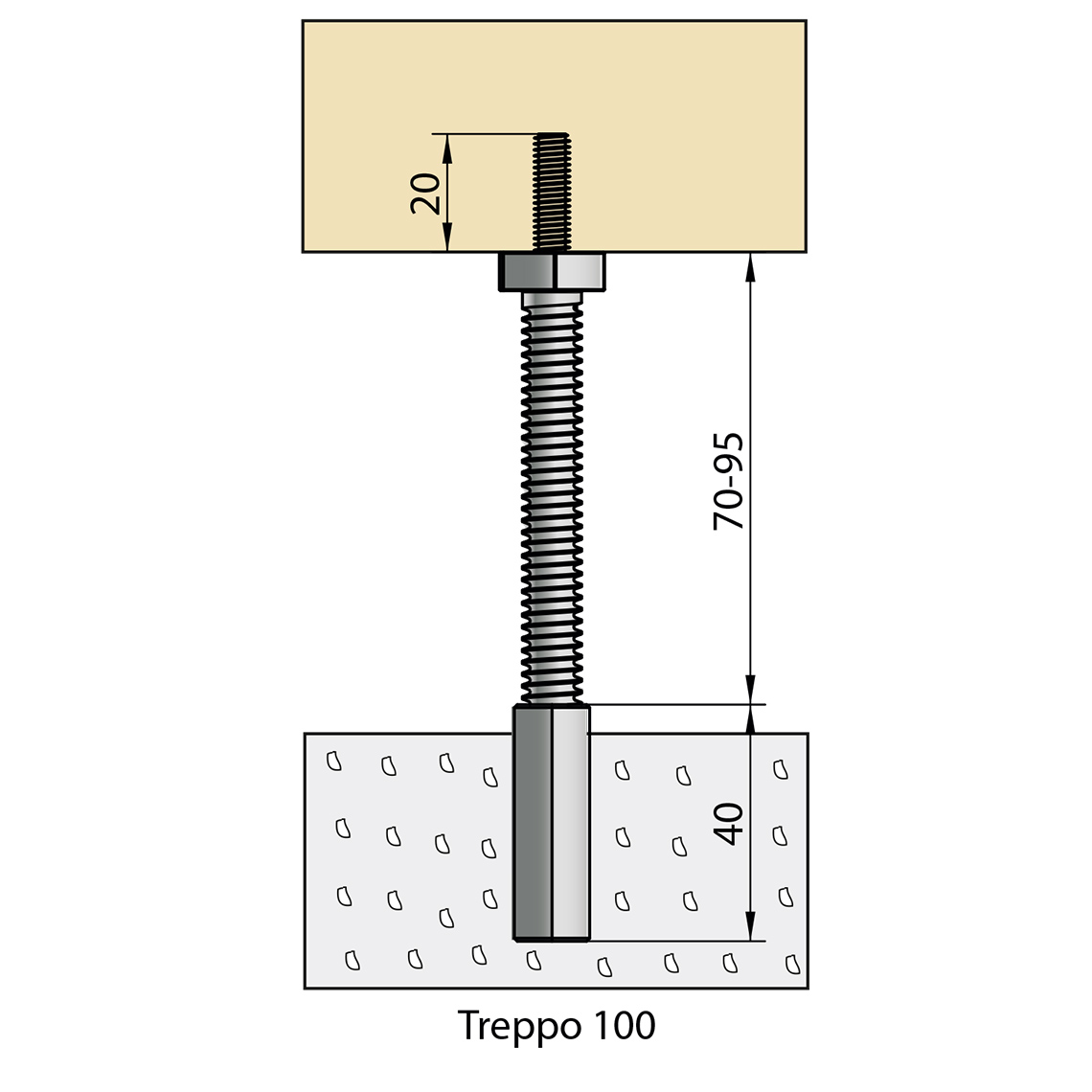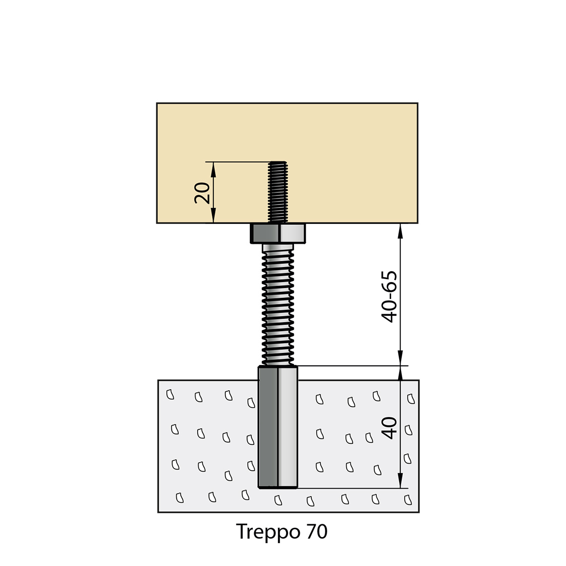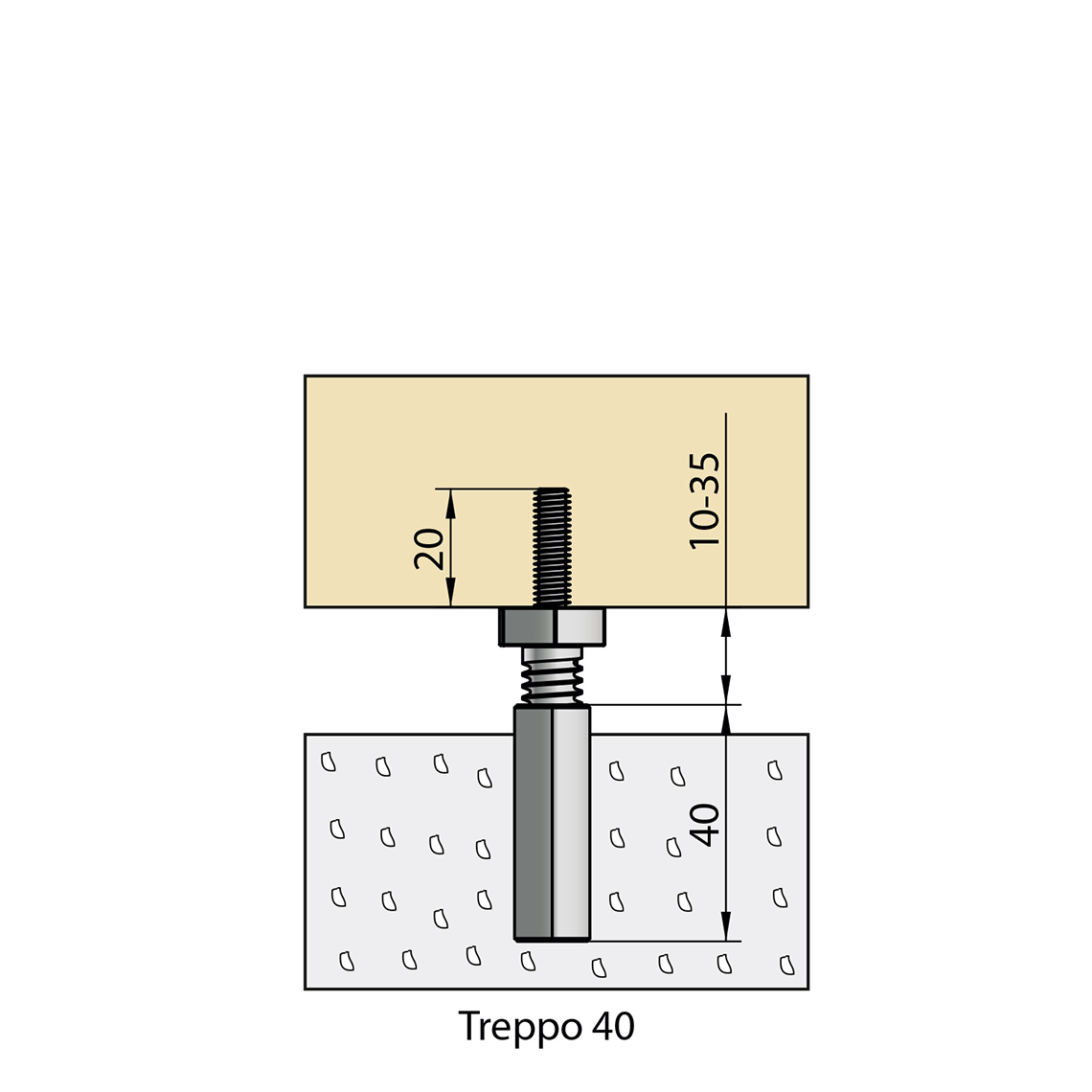 Ein TREPPO besteht aus einem Sechskantdübel 40 mm, einer Nivellierschraube M10 (erhältlich in drei Längen, 40mm, 70mm und 100mm) und einem Gewindestift M6x30.
