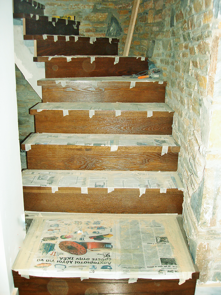 4 – 6 Bohrungen, ø 14 mm, max. 40mm tief (Tiefenanschlag verwenden!), frei verteilt in den Stufentritt bohren. Die Bohrlöcher ausblasen. und befeuchten.