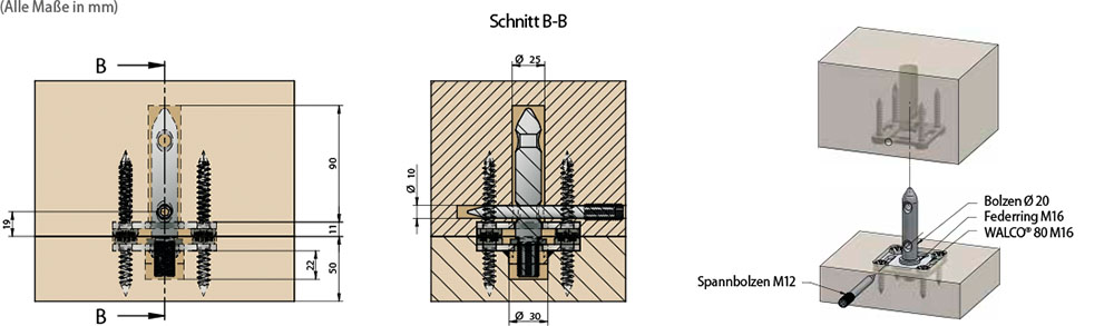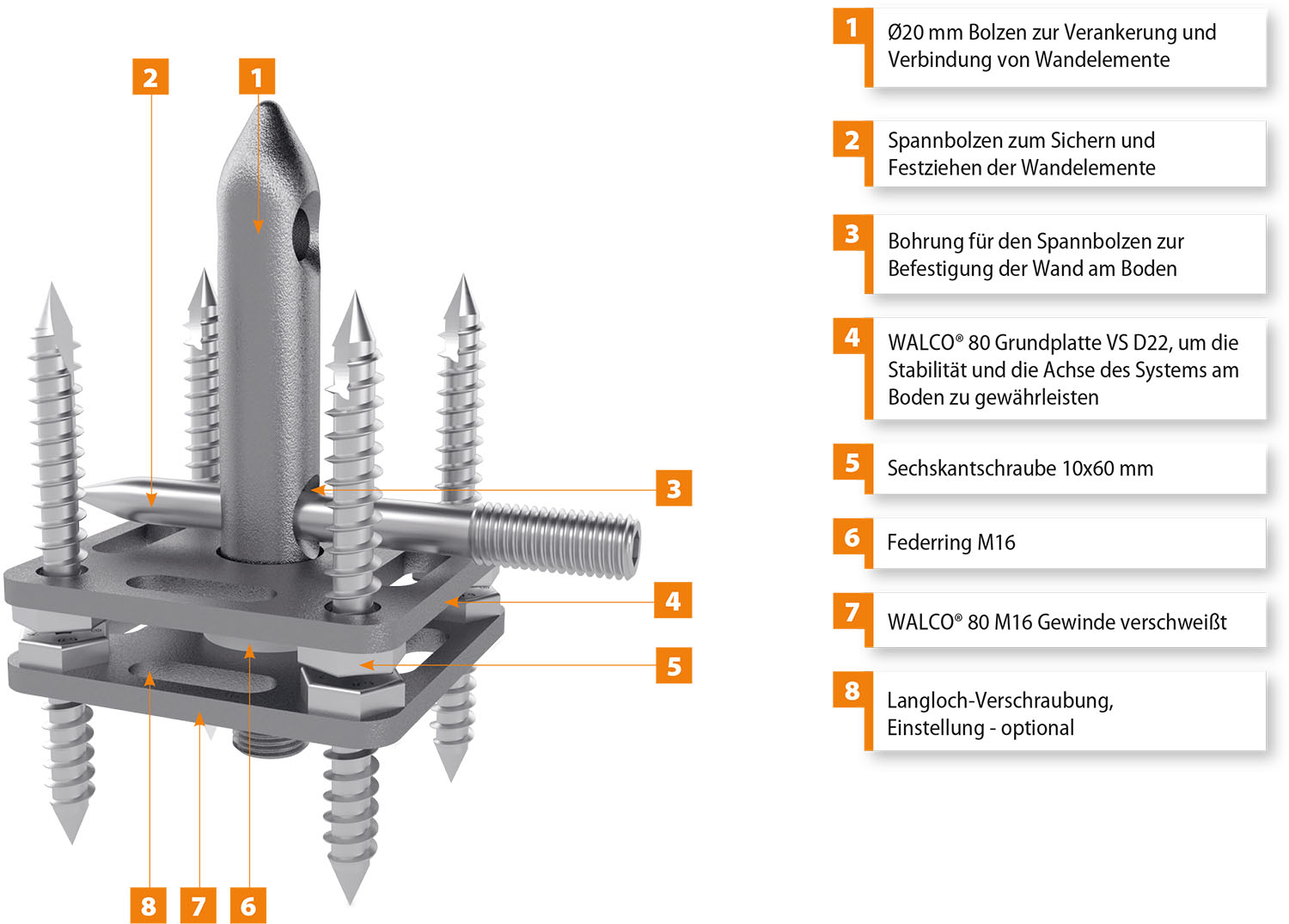 - Durch die Langlöcher des WALCO® 80 Grundplatte ist eine Nachjustierung bei aufgeschraubter Variante möglich
