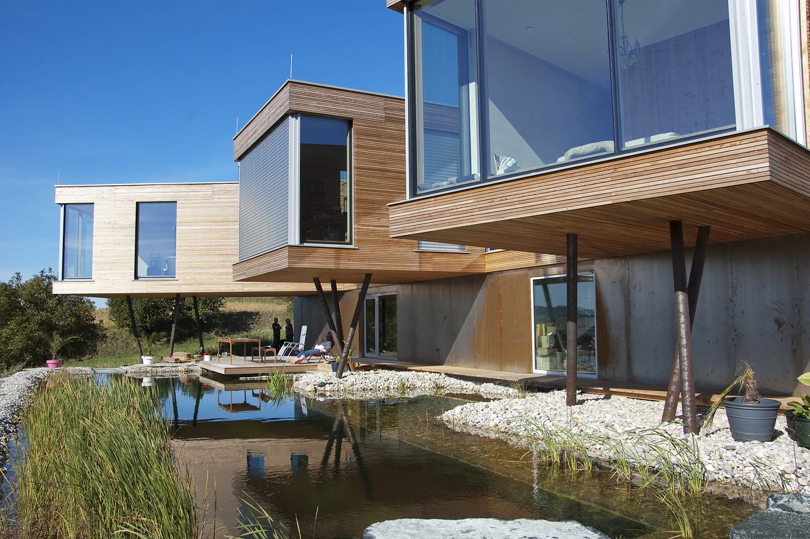 Details: Ein Baukasten für jedermann – Beim Design unseres ECOLAR Hauses standen 2 Grundsätze im Vordergrund: Modularität und Flexibilität. Diese Leitmotive ziehen sich durch das ganze Konzept – begonnen bei der Konstruktion, bis hin zur Gestaltung des Innenraums. Daher haben wir ein einfaches System entwickelt: Wie bei einem Baukasten gibt es wenige standardisierte Elemente aus denen sich beliebig viele Varianten gestalten und nachträglich verändern bzw. auseinandernehmen lassen. In einem Grundraster von 4,30m auf 4,30m können unterschiedliche Raumkonfi gurationen für verschiedenste Nutzungen entstehen. Die Fassaden können dann einfach in dieses Grundgerüst eingesetzt und nach Bedarf opak, transluzent oder transparent ausgebildet werden. All diese Elemente sind als Fertigbauteile mit hoher Massgenauigkeit vorproduziert. Somit können Zeit, Geld und Material effizient genutzt werden.