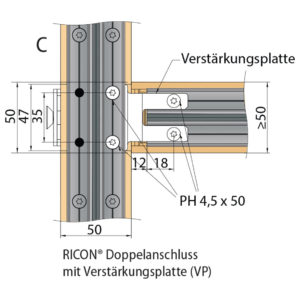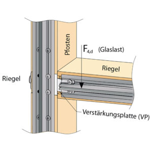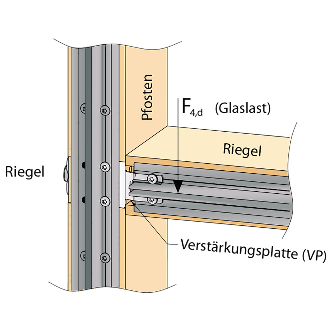 Die Verstärkungsplatten für den RICON® ermöglichen Pfosten-Riegelverbindungen, die besonders starken Belastungen standhalten. Damit können bis zu 1.100 kg Glaslast übertragen werden. Sie verkürzen den außermittigen Hebel, steigeren die Lastaufnahme und verhindern die Torsion des Riegels.