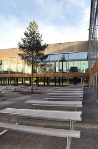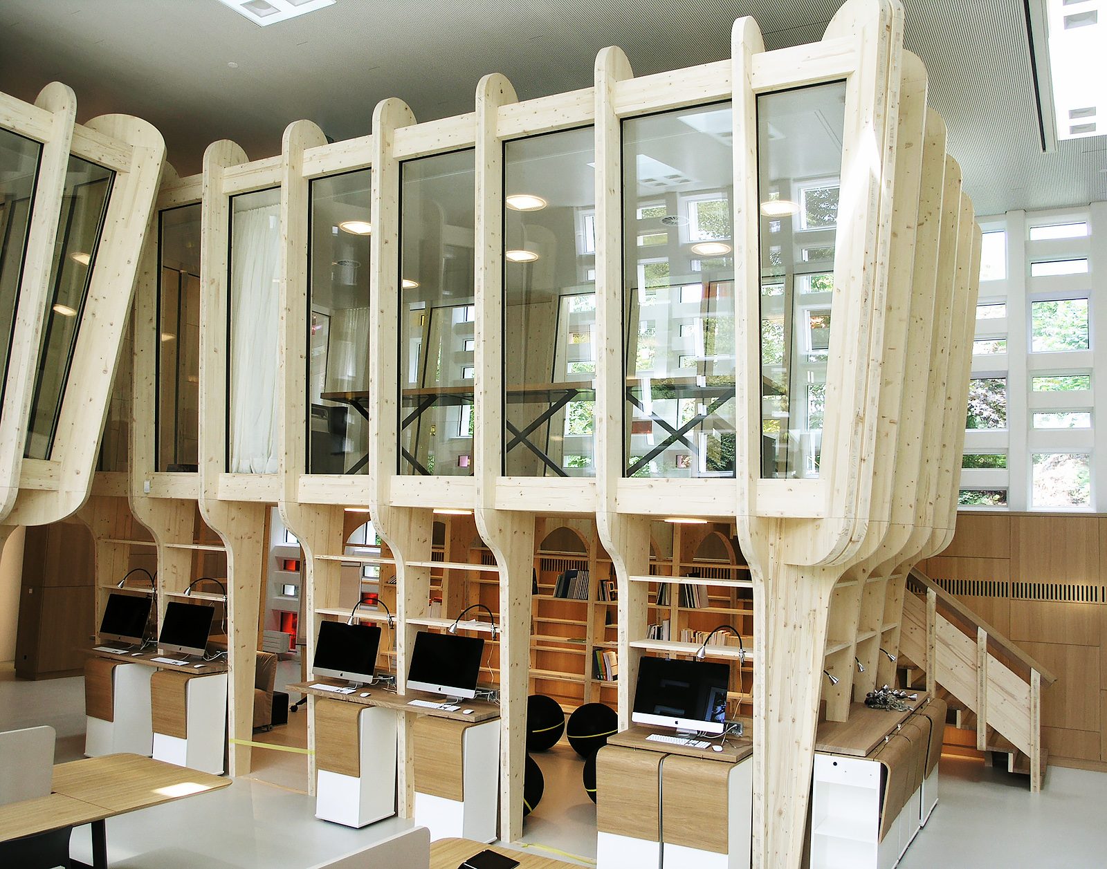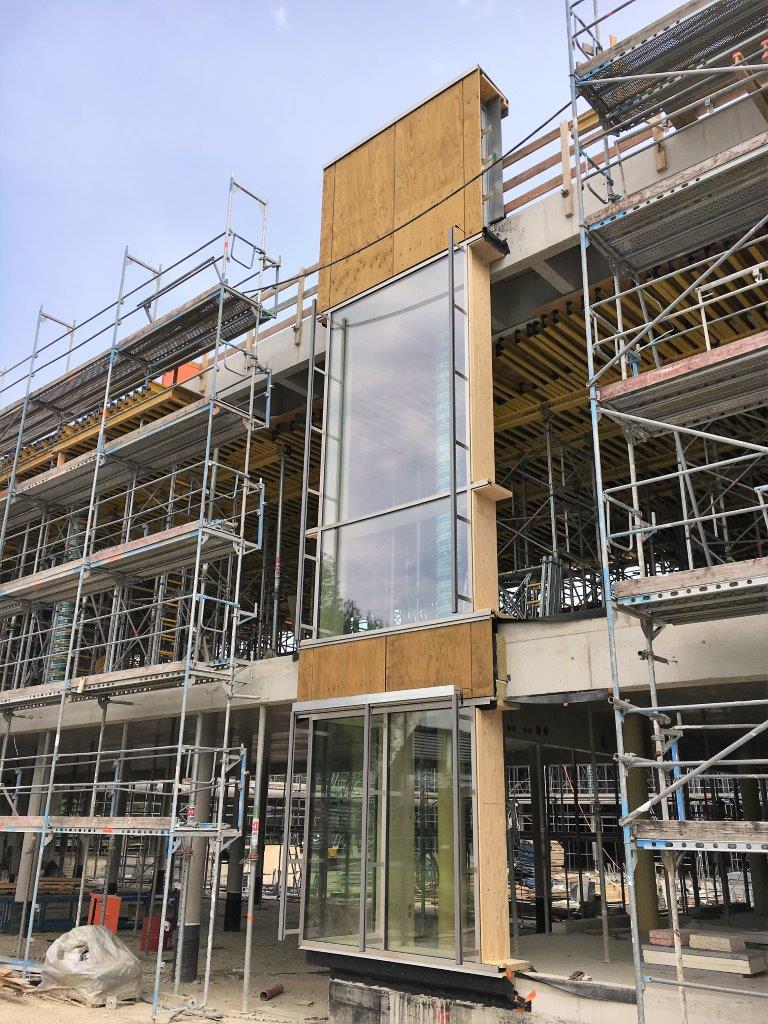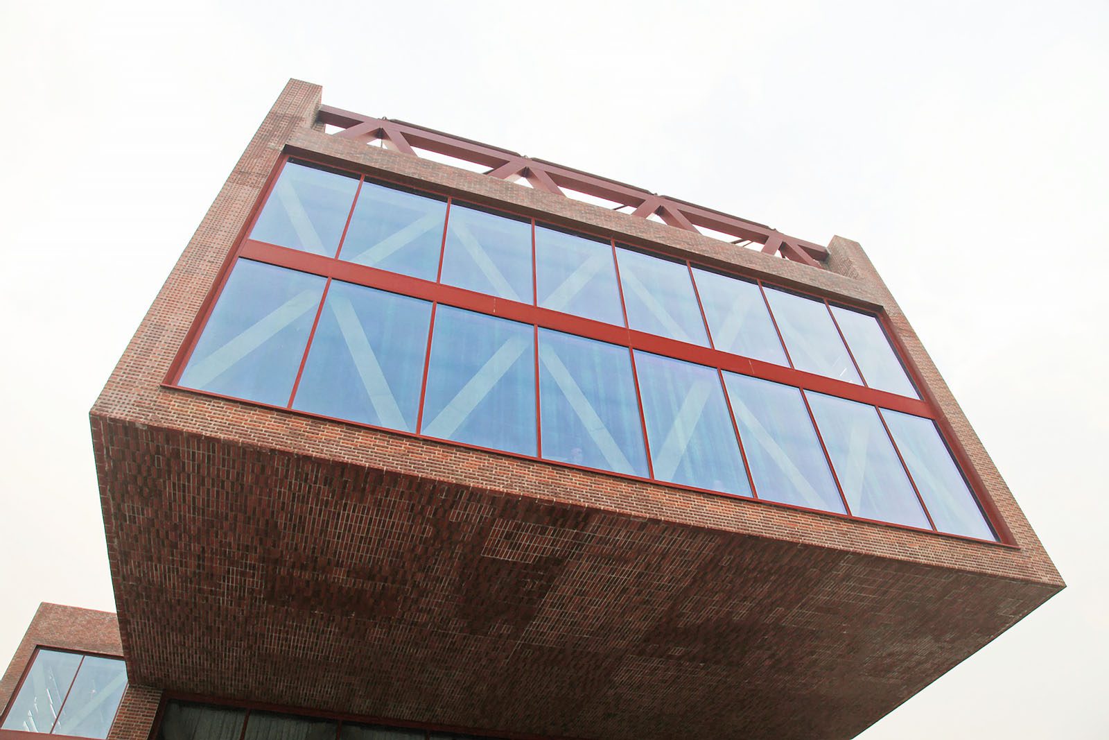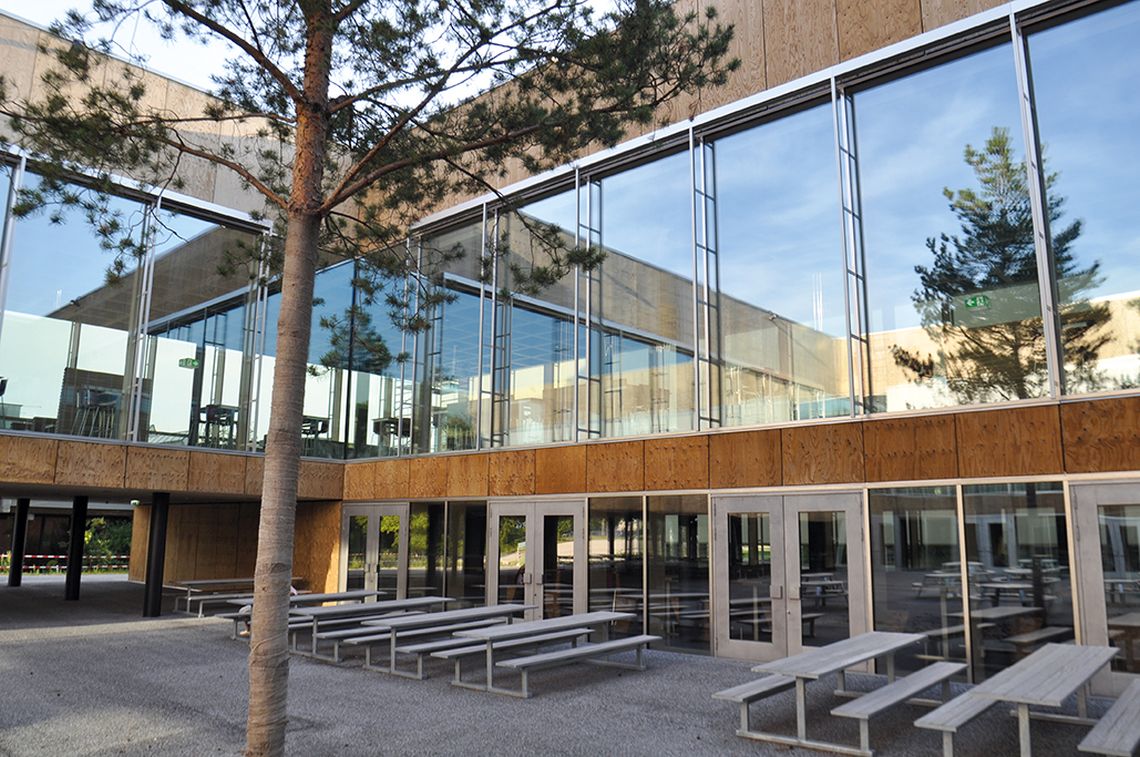 Bauweise: Eine modulare Konstruktion, die vollständig in der Werkstatt vorgefertigt und dann auf 2 Ebenen um einen offenen und großzügig verglasten Raum herum aufgebaut wurde. Die Glasfassade bietet einen Raum das zu Austausch und Begegnungen einlädt.