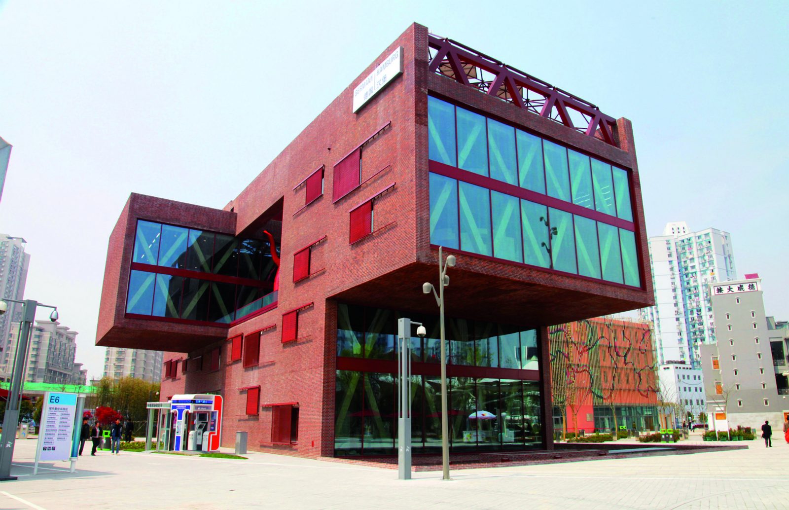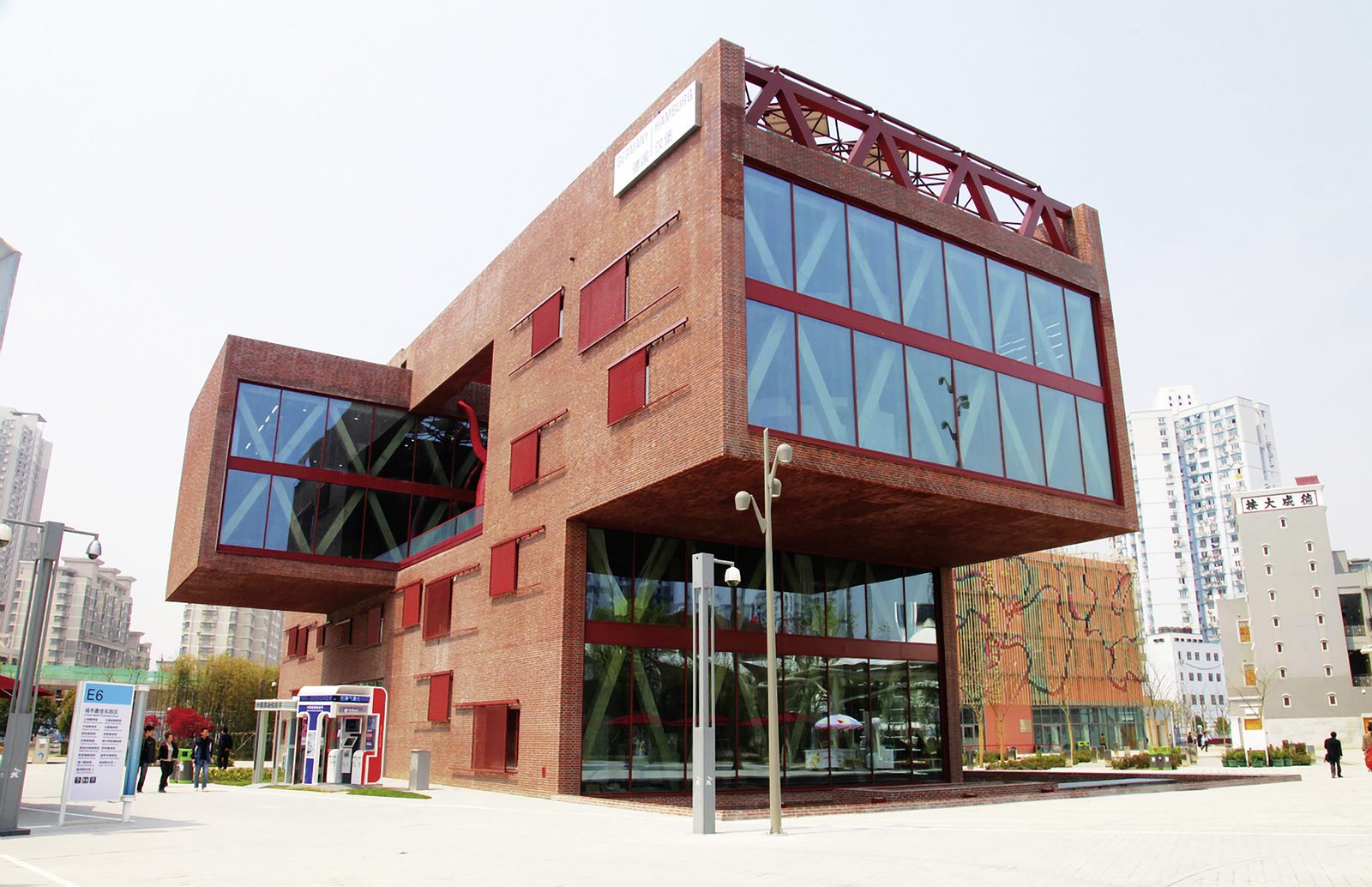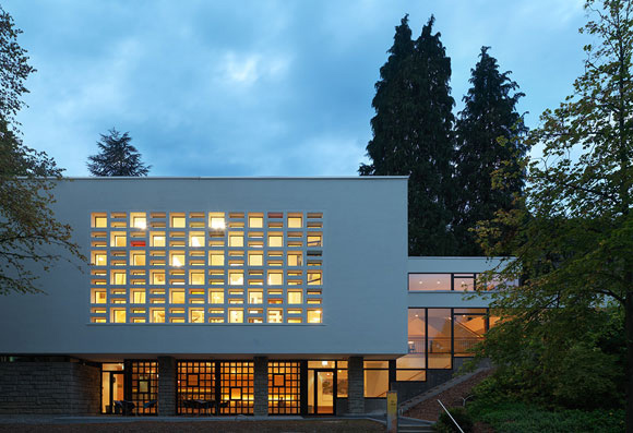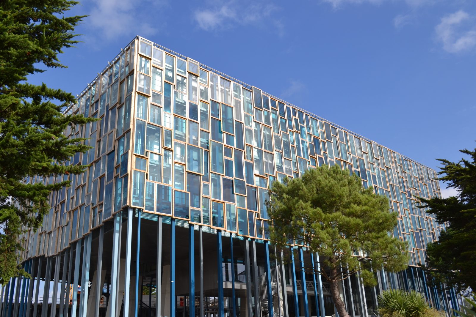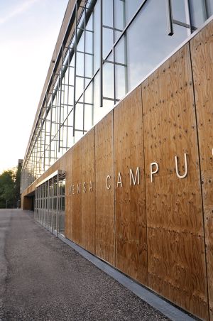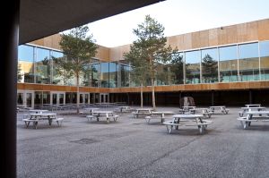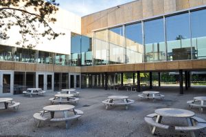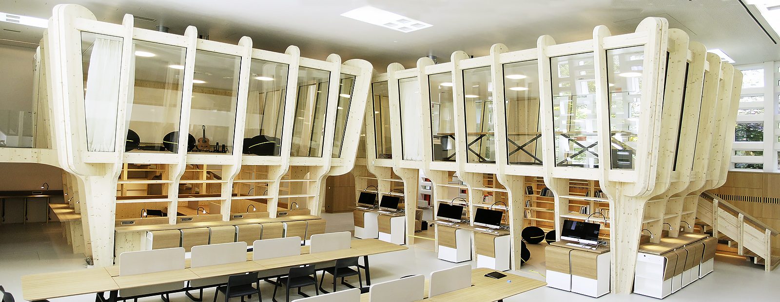Bauweise: Eine modulare Konstruktion, die vollständig in der Werkstatt vorgefertigt und dann auf 2 Ebenen um einen offenen und großzügig verglasten Raum herum aufgebaut wurde. Die Glasfassade bietet einen Raum das zu Austausch und Begegnungen einlädt.