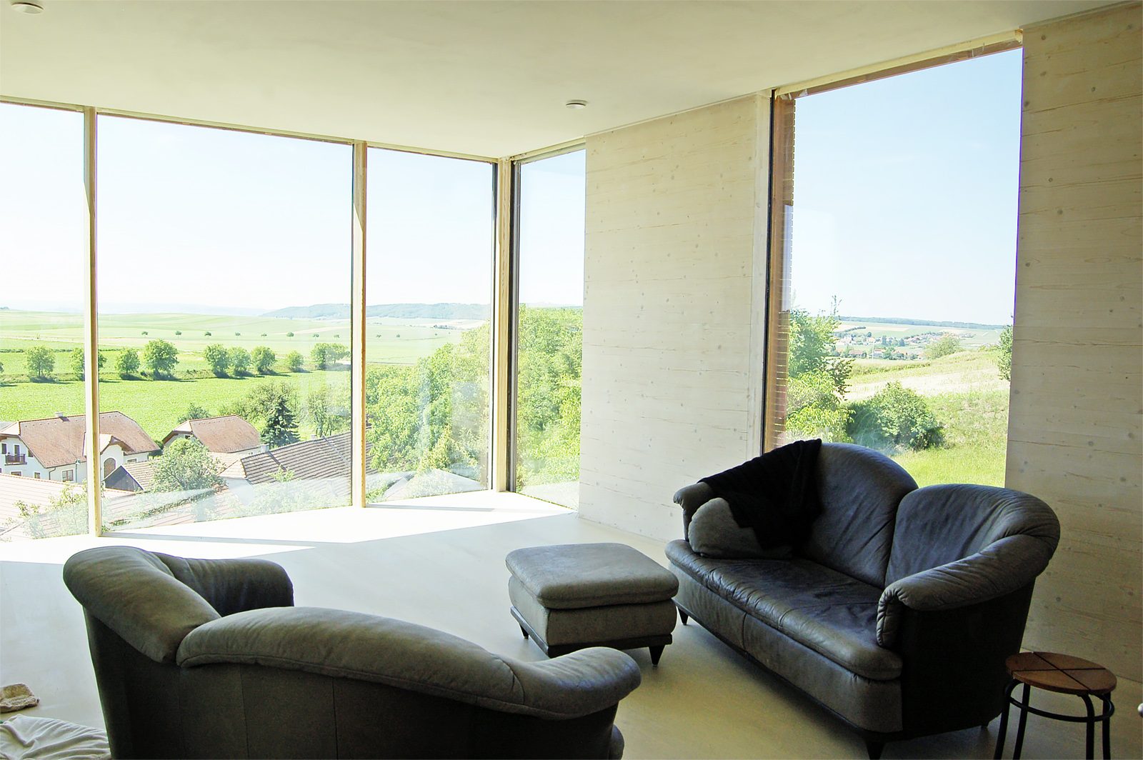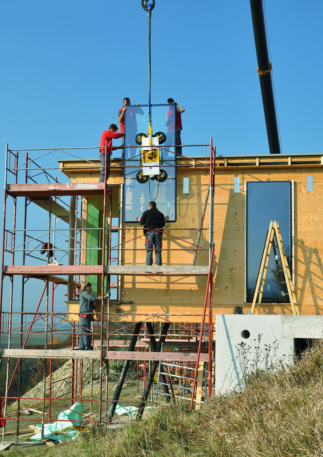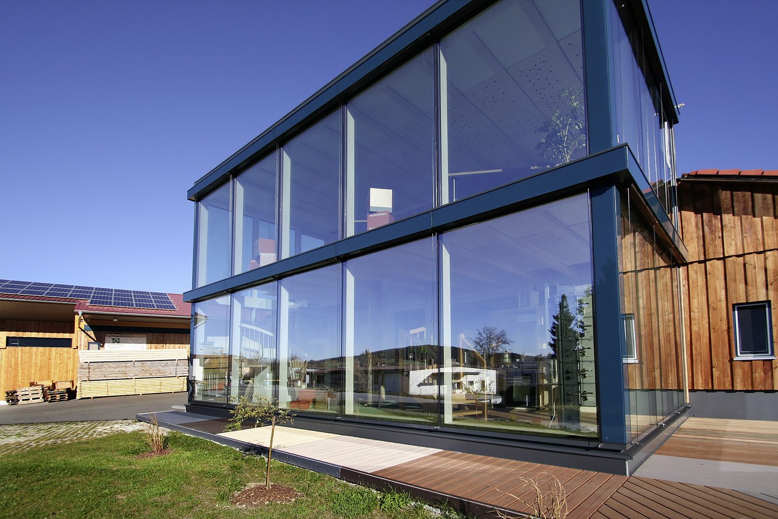 Bauweise: Holz-Massivbauweise aus Brettsperrholzwänden mit statisch tragender Fixverglasung