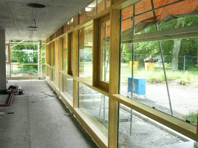 Bauweise: Metall- und Pfostenriegel Holz-Glasfassade