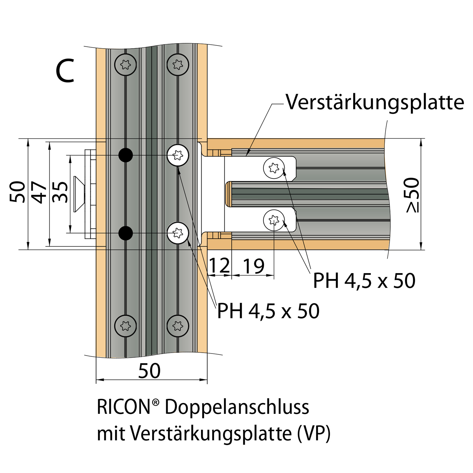 Der Haupt-/Nebenträgerverbinder RICON® besteht aus zwei baugleichen Verbinderplatten aus Stahl. Ein optionaler Sperrbügel verriegelt entgegen der Einschubrichtung. Das Verbindungssystem wird für nicht sichtbare Anschlüsse mit Holzbreiten ab 50 mm eingesetzt. RICON® ist als Einzelanschluss und Doppelanschluss in sechs Größen 60, 80, 100, 120, 140 und 160/40 erhältlich. Der RICON ist auch in Edelstahl verfügbar.