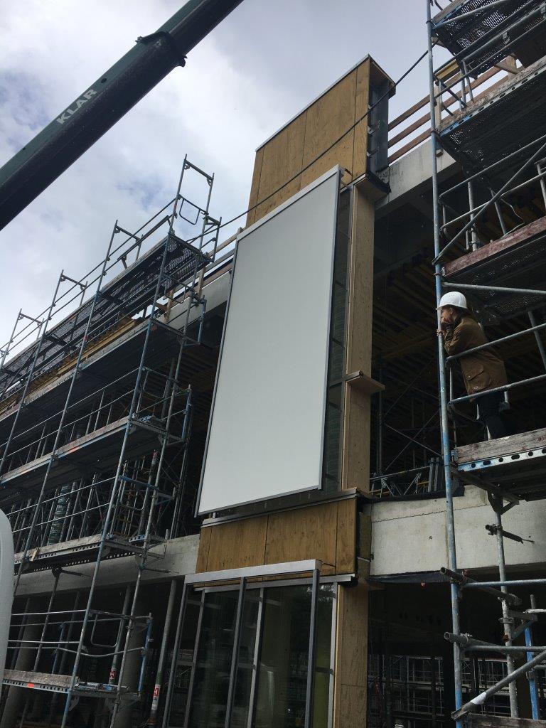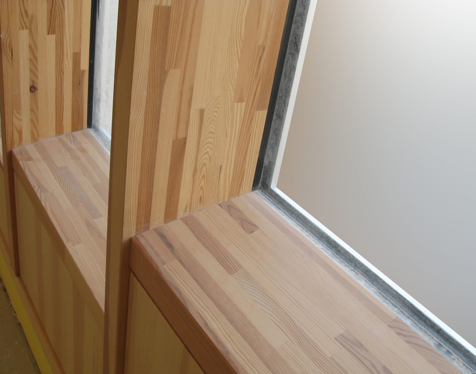 Bauweise: Pfosten-Riegel-Fassade aus Kerto